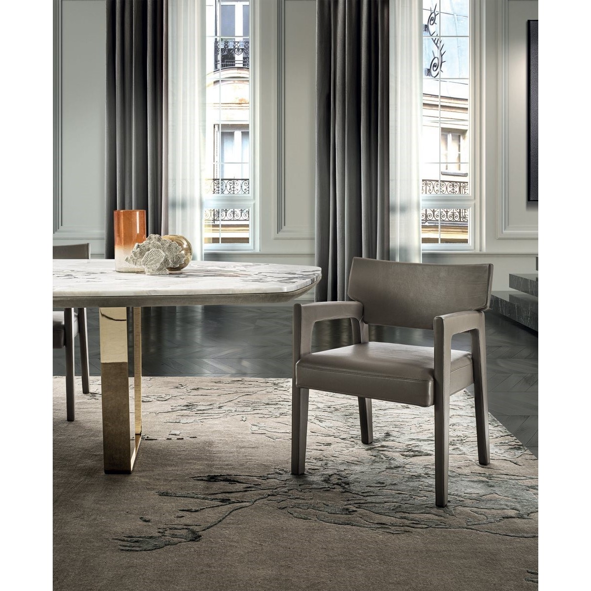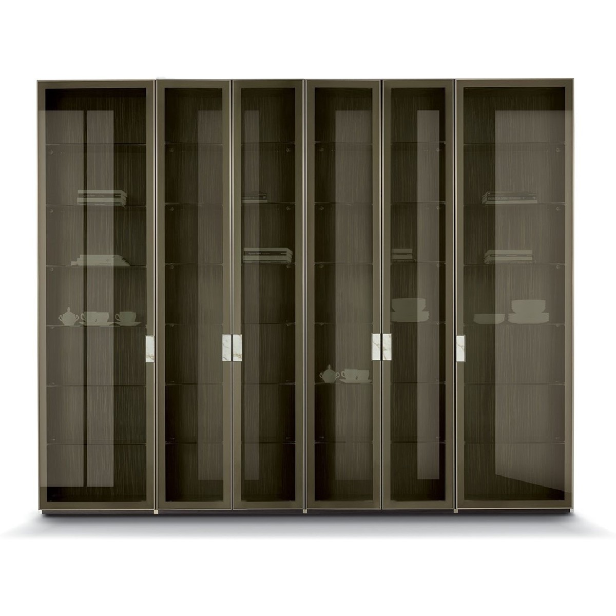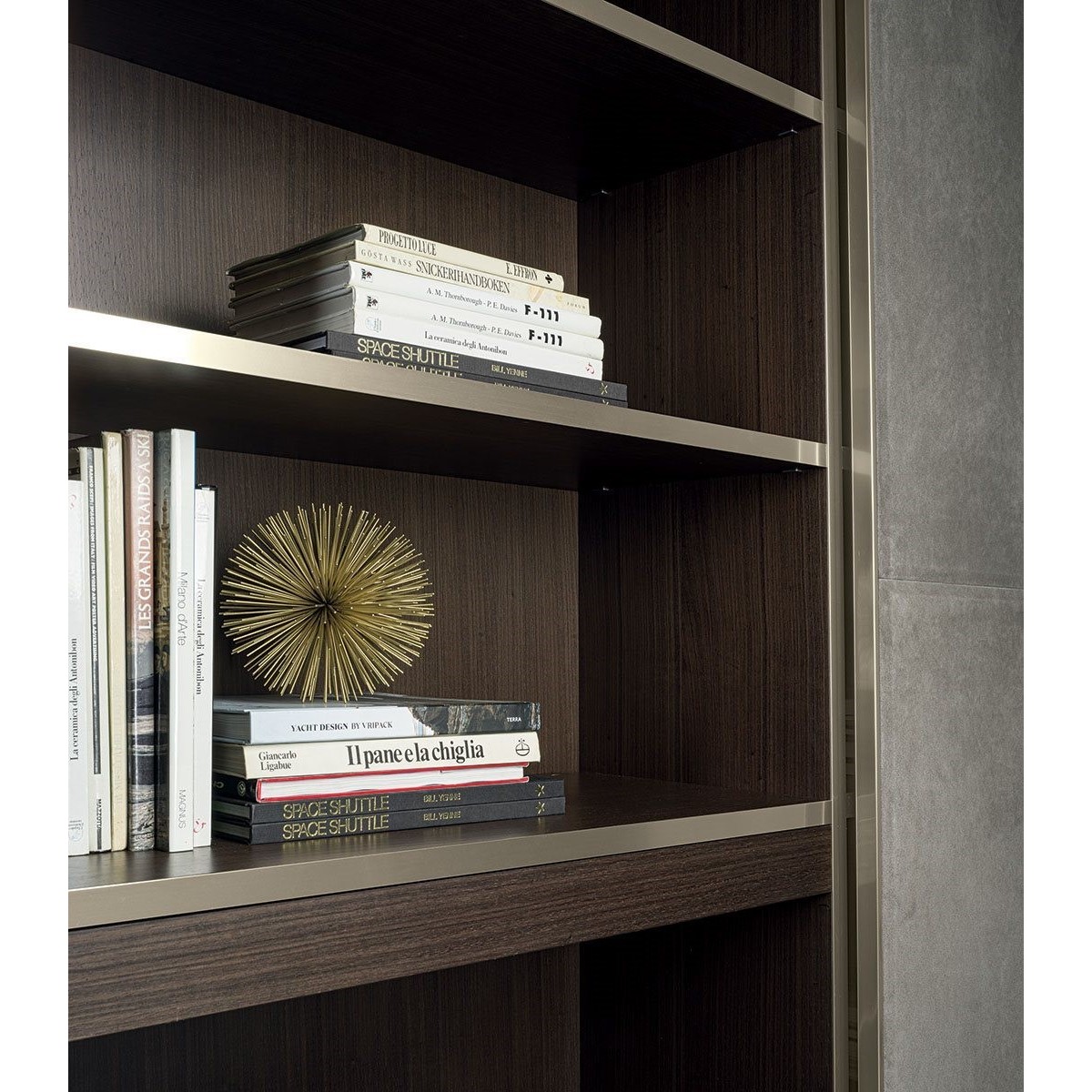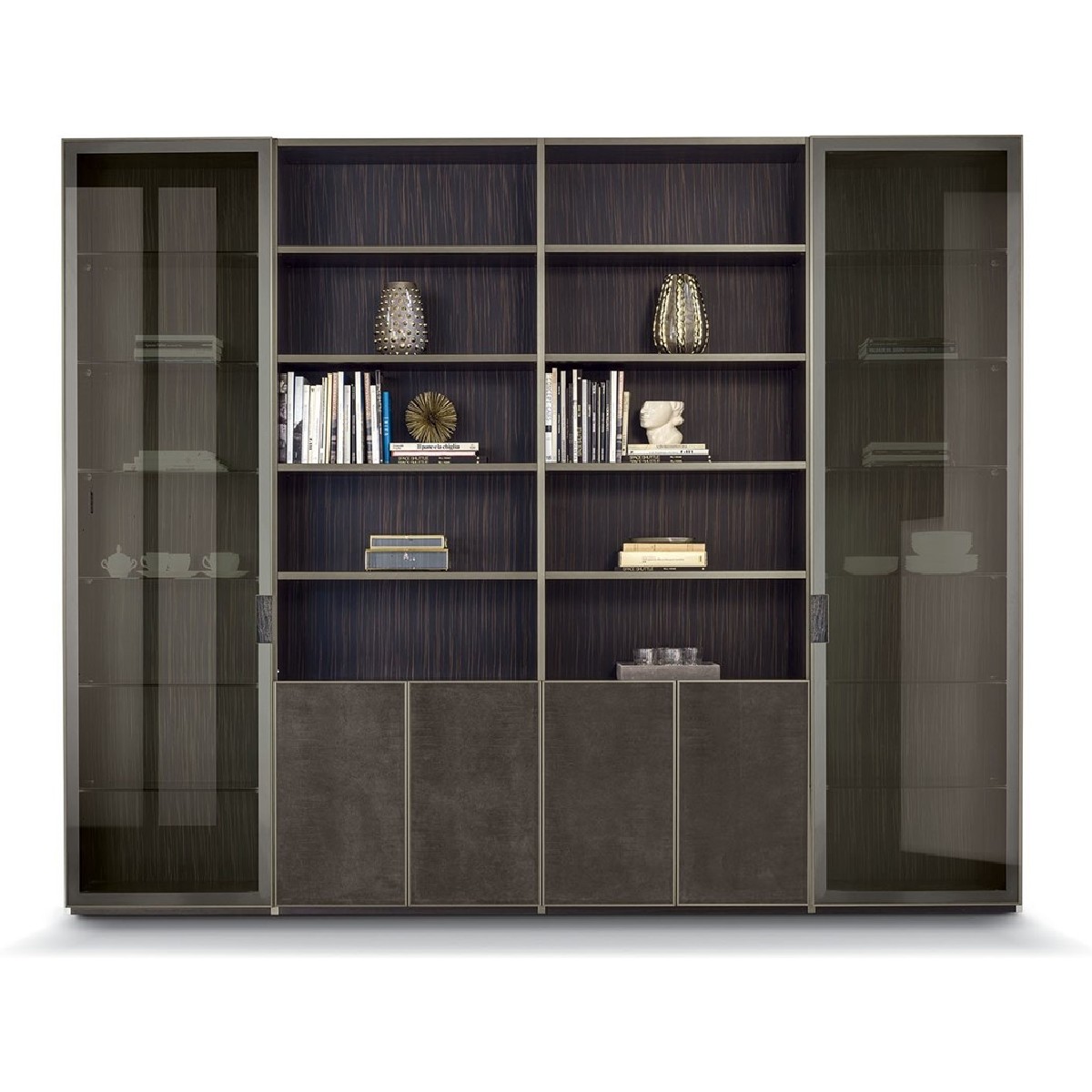 Ianus Middle is a modular system for building equipped partition walls with open compartments, chests of drawers, shelves and small doors that can be inserted to perfectly complete the modular nature of the boiserie panels and the doors. The structure is in veneered wood in the finishes: matt tinted Zebrano wood, matt Canaletto walnut, matt Newood Ebony or closed pore matt lacquer. Front edges of modules and door profiles are in anodized aluminium finishes, as follows: Matt Platinum, Matt satin bronze, Bright Aluminium, Bright Champagne Gold, Bright dark brown electrocolour. The shelves are in dark matt tinted Zebrano wood, matt Canaletto walnut, matt Newood Ebony, closed pore matt lacquer, covered in P.3 Cat. Suede or Tecsuede, or in natural, bronzed, or smoky 8 mm glass. Drawer fronts are covered in leather P.3 Cat. Suede or Tecsuede. Drawer interior bottoms are in wood or lined with leather P.3 Cat. Suede or Tecsuede. The side panels have LED lighting over their entire height. The system includes a special 180 cm module customizable for the TV. NOTE_the side panel includes an adjustable foot.
