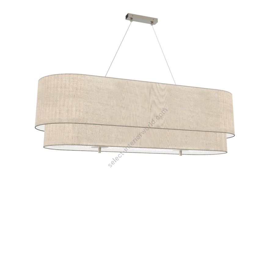 Dieser Kronleuchter mit seinem ausgeprägt ausgewogenen ästhetischen Sinn besteht aus zwei ovalen Lampenschirmen aus elfenbeinfarbenem Stoff und Metallteilen in hellgoldener Ausführung mit einem unteren Glasdiffusor.