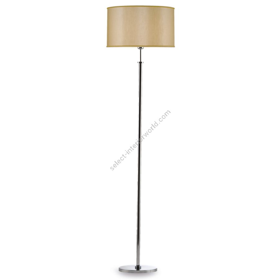 Bestehend aus einem Messingschaft mit linearer Form und Chromoberfläche und ergänzt durch einen zylindrischen Lampenschirm aus sandfarbenem Stoff. In verschiedenen Farbvarianten erhältlich.