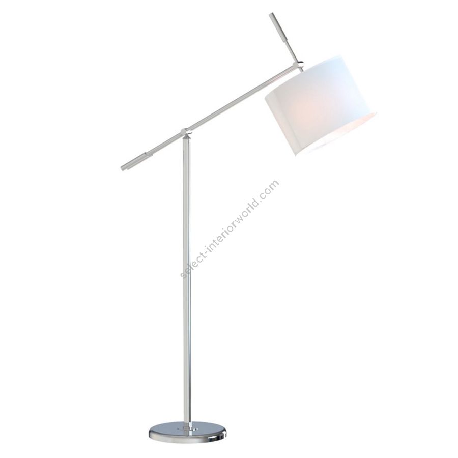 Stehlampe im modernen und äußerst vielseitigen Stil, bestehend aus einer linearen Struktur aus verchromtem Messing, die von einem runden Sockel aufsteigt und in einem zylindrischen Lampenschirm aus weißem Stoff endet.