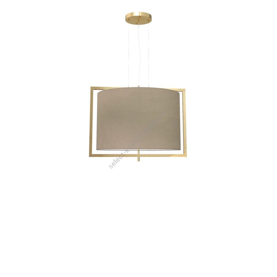Dieser Kronleuchter mit seinem ausgeprägt ausgewogenen ästhetischen Sinn besteht aus einer rechteckigen Außenstruktur aus poliertem Messing und einem inneren zylindrischen Lampenschirm aus glattem haselnussfarbenem Stoff mit Glasdiffusor.