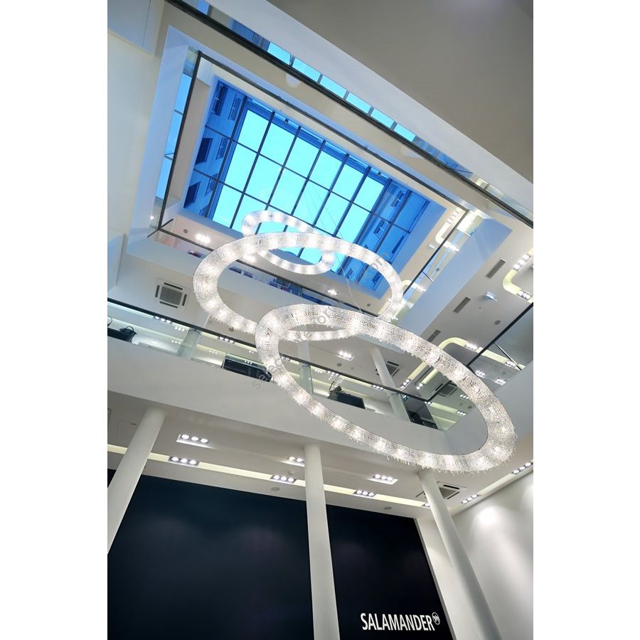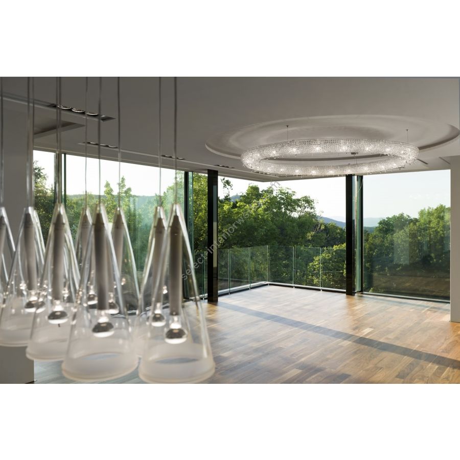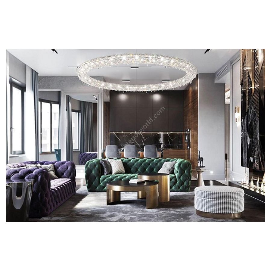 Looop crystal chandelier is a modern interpretation of one of the most ancient forms—the circle, a symbol of wholeness, eternity, and perfection. With its sleek, minimalist design, this crystal chandelier brings a sense of sophistication and tranquility to any setting, ranging from luxury villas to restaurants and commercial spaces. Its sculptural presence makes it ideal for spacious interiors where it creates a perfect balance between light and its surroundings. Looop is available in various sizes and crystal color combinations and can be displayed alone or in clusters of different sizes and arrangements. In addition to our standard premium crystal selection, Looop crystal light is available with 100% Swarovski® crystals.