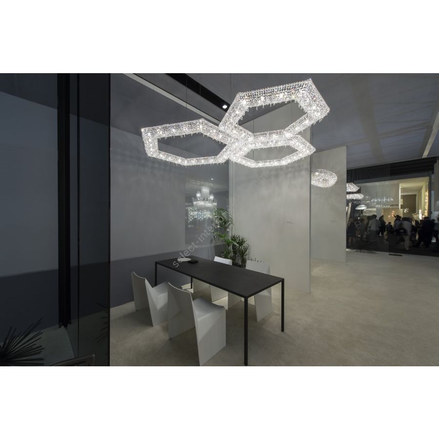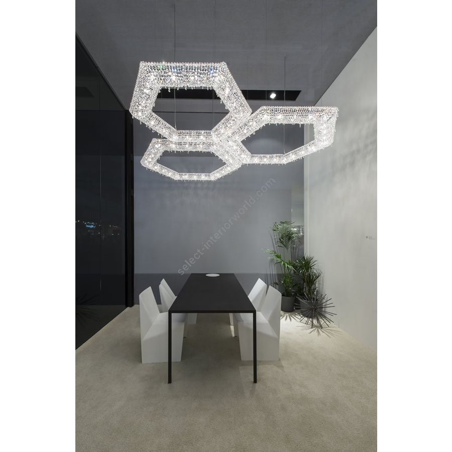 The exclusive hexagon of Su is an alluring contemporary chandelier, which will create a complex geometrical light and bring a luxurious touch to a modern interior. Our Su model is able to shape a space and complement it with its natural and modern vibe. You can choose a transparent or coloured crystal combination in standard sizes. Depending upon the interior it is placed in, Su can be installed on its own or looks gorgeous in geometrical clusters of various sizes.