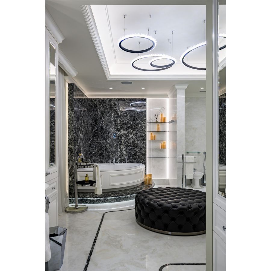 Halo crystal chandelier, inspired by the radiant glow of celestial bodies like the sun and moon, is designed to refract light with the brilliance of ice crystals in the atmosphere. Crafted with minimal materials and the precision of a handmade crystal chandelier, the Halo crystal lamp feels both weightless and substantial, as an embodiment of refined simplicity. Its crystals are arranged into delicate branches that resemble frosted rays, scattering light into a cascade of sparkles and creating a warm, radiant glow. This minimalist crystal chandelier invites viewers to experience the beauty of pure light. With its contemporary silhouette and clean geometry, this modern crystal lamp integrates effortlessly into both classic and modern interiors. The Halo chandelier can be installed vertically or horizontally, displayed as a single statement piece or in clusters, offering limitless versatility in luxury design settings.