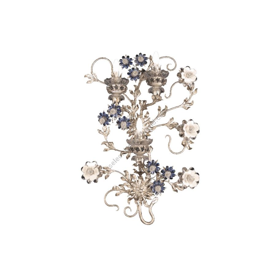 3 lights wall lamp in wrought iron with clear and colored Bohemian crystal and biscuit ceramic