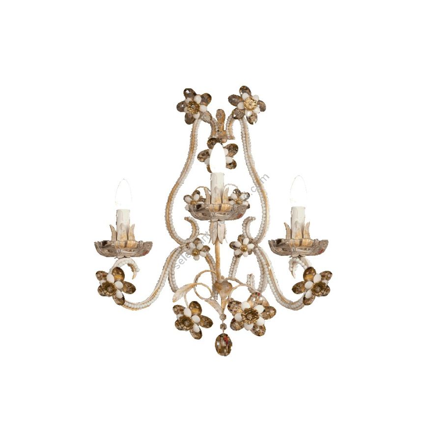 3 lights wall lamp in wrought iron with coloured Bohemian crystal and coloured pearl banding