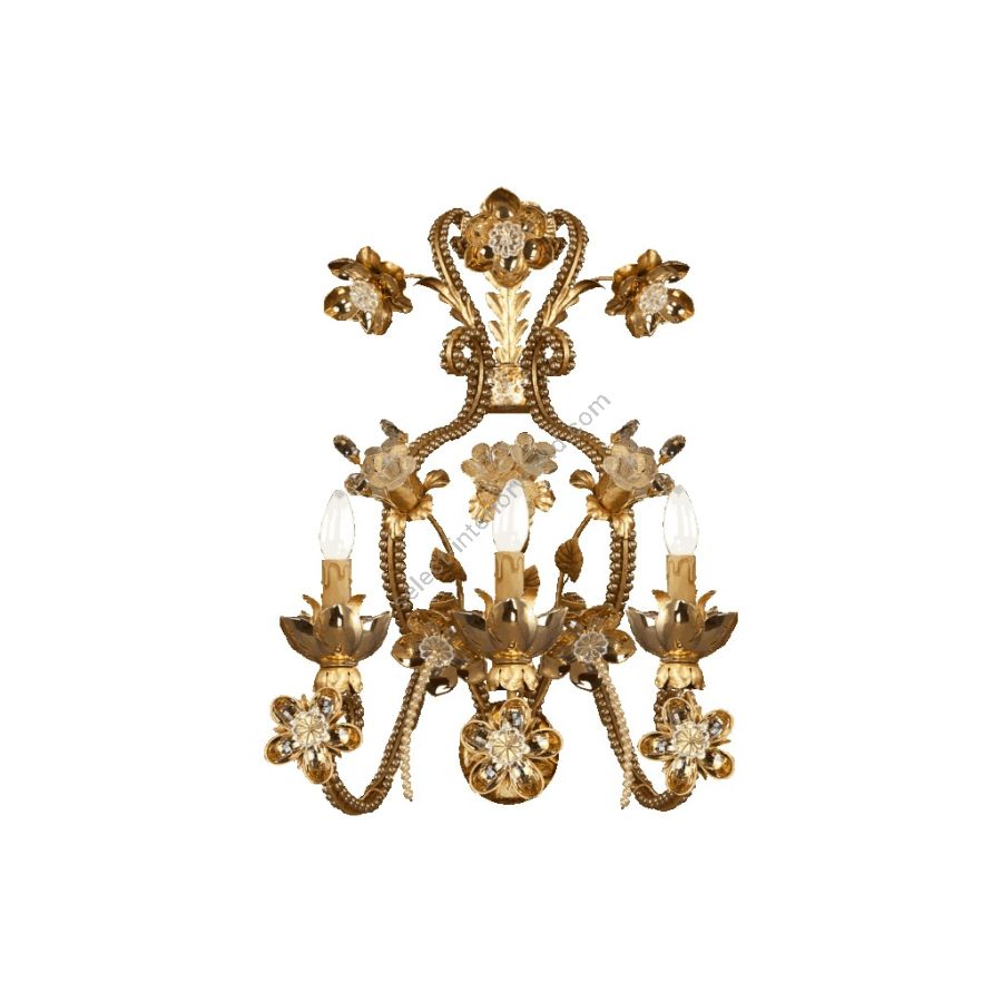 3 lights wall lamp in wrought iron with clear and coloured Bohemian crystal, Murano glass, clear pearl banding and porcelain