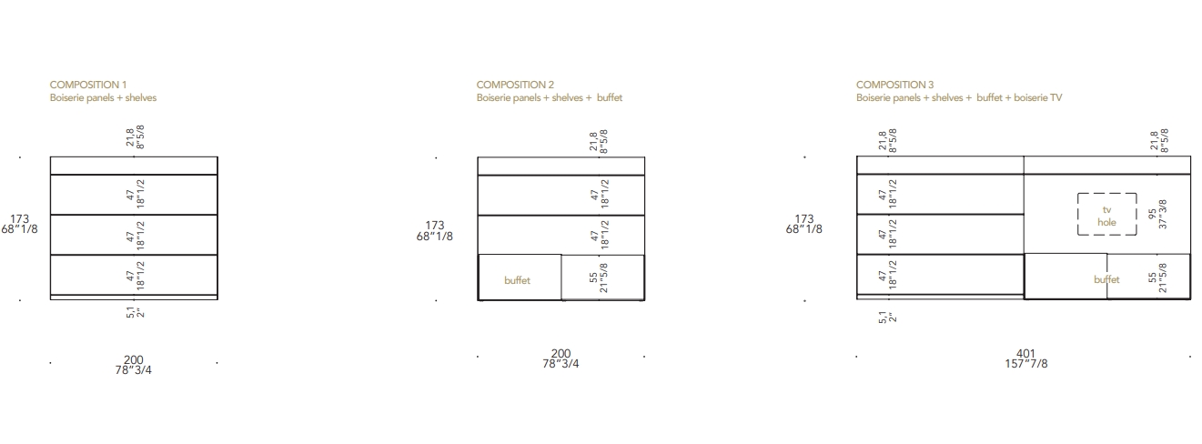 Modulares Wandsystem mit einer Kombination aus Täfelungen, Regalen und Aufbewahrungseinheiten.