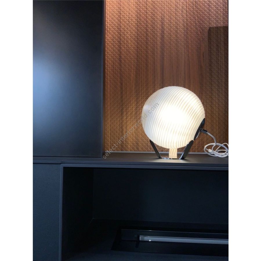 Die zeitlose Kugelform, neu interpretiert mit einer kompakten Wellenoberfläche, die die Lichtverteilung verbessert. Die Familie umfasst Pendelleuchten in zwei Größen, Tischleuchten und Stehleuchten. Diffusor aus weiß schattiertem Murano-Milchglas und lackierter Metallstruktur.