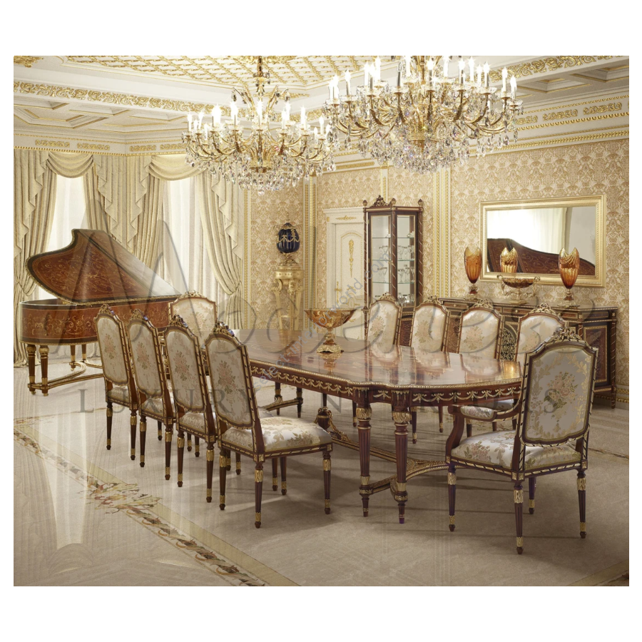 Ein klassischer großer Tisch mit einer aufwendig gestalteten Intarsienplatte bietet Platz für bis zu 10 Personen und ist rundherum mit goldenen Motiven verziert, um die Vornehmheit und Erhabenheit des Tisches zu unterstreichen. Die subtile Zartheit und Noblesse, die dieser Tisch verkörpert, kann leicht im Raum platziert werden und ein Statement setzen.