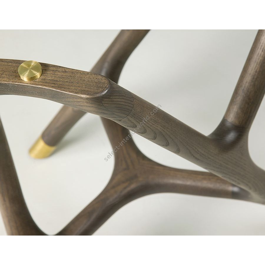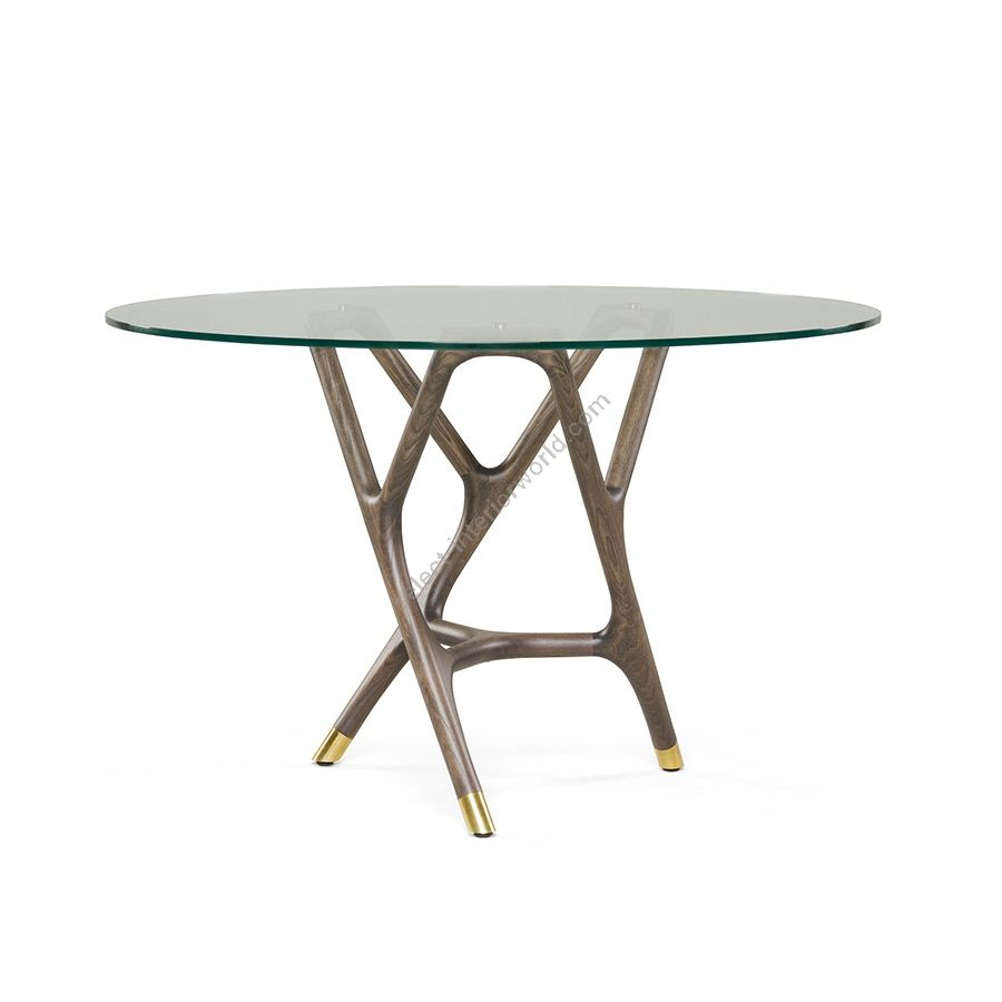 Tisch aus Eschenholz mit Glasplatte und Messingdetails.
