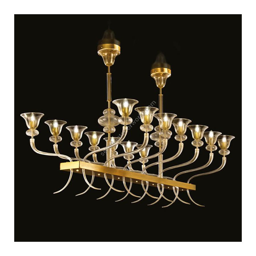 Im Katalog schlagen wir Cellini in Goldfarbe vor: reines gebürstetes Gold für die Struktur und gesprenkeltes goldenes Glas. Ein kostbarer und dennoch zarter Kronleuchter, der den gesamten umgebenden Raum verschönern kann. Cellini ist mit seinen 14 Lichtern die ideale Lösung, um breite rechteckige Räume zu beleuchten.