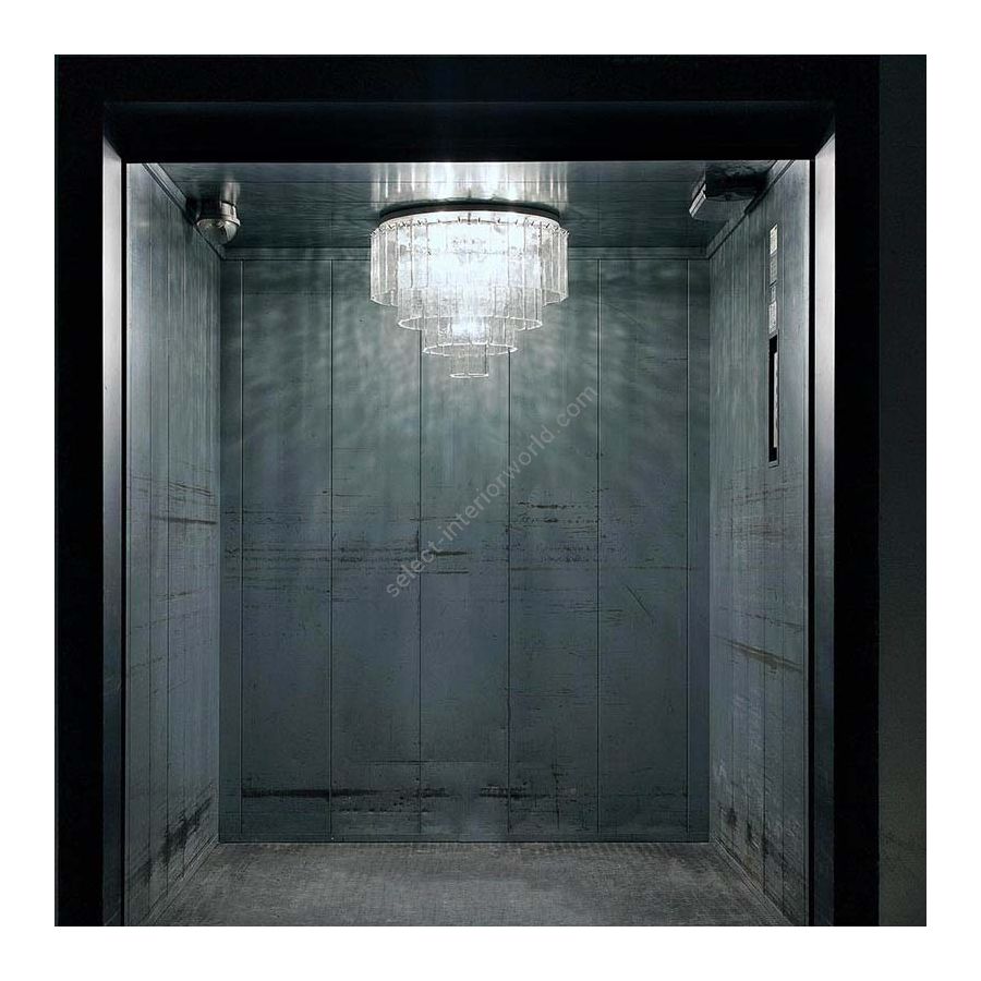 Bei Wiederholung erinnert die modulare Platte an den Rand des Kleides der Charleston-Tänzer - und deshalb heißt diese Kollektion Charleston. Eine einfache und dennoch raffinierte und kostbare Deckenlampe: Die Glasplatten werden mit einer bestimmten Technik hergestellt, die die Textur des Glases erhöht. Die Struktur von Charleston erlaubt die maximale Freiheit beim Zusammenstellen der Muster.