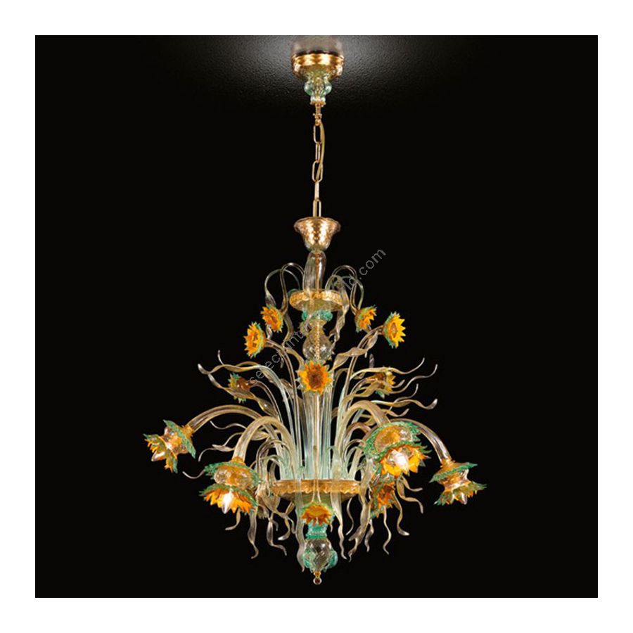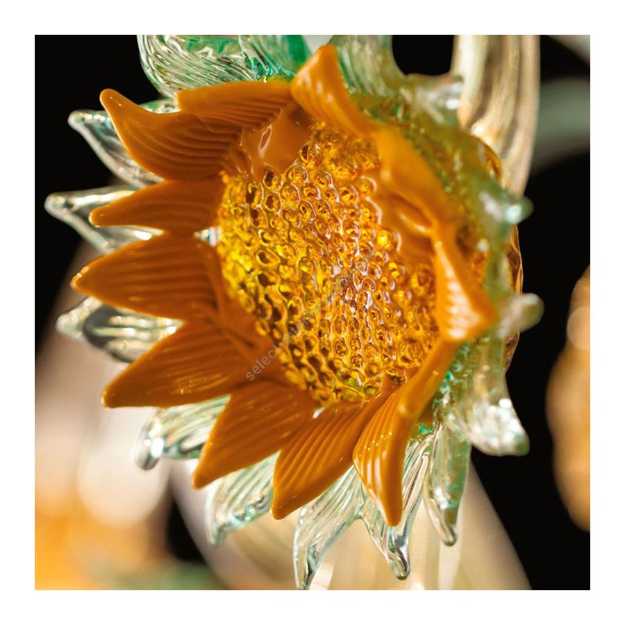 Aus dem Herzen des Kronleuchters sind einige Stängel ausgebreitet, an deren Ende eine gläserne Sonnenblume angebracht ist. Winzige Dekorationen, die einigen pflanzlichen Elementen ähneln, vervollständigen den Kronleuchter und verleihen der gesamten Struktur eine gewisse Dynamik. Die Farben unterstreichen die Einzigartigkeit dieses Kronleuchters: Der goldene Ton der Struktur wird mit den warmen Tönen der Blumen kombiniert, die gesamte Struktur ist mit grünen und bernsteinfarbenen Details verziert.