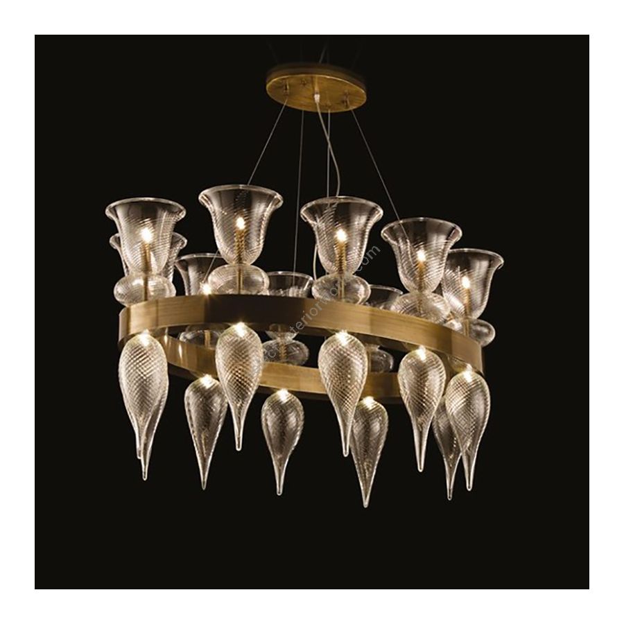 Die Kronleuchterkollektion Heritage aus geblasenem Glas Heritage ist mit großen Glaselementen verziert, die mit der Rigamenà-Technik dekoriert sind. Diese Textur verstärkt die Blendung auf der Glasoberfläche und bildet einen schönen Kontrast zur polnischen Metalloberfläche des Ovals.