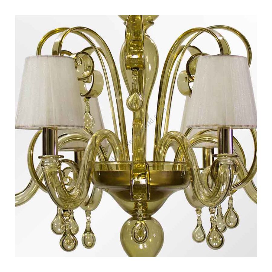 Die Lampenschirme bestehen aus durchsichtigem Seidenplissé-Stoff und die an den Armen und an den dekorativen Elementen hängenden Anhängerelemente machen dieses Produkt zu einem juwelenartigen Kronleuchter, der sich perfekt für moderne Räume sowie für minimale Räume eignet.