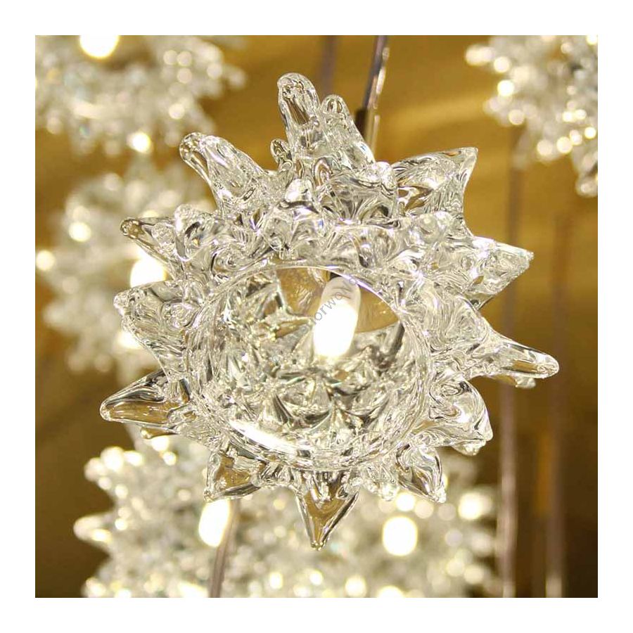 Die Deckenleuchte Scintilla ist eine wertvolle Lichtarbeit und zeichnet sich durch Eleganz und Raffinesse aus. Die Kristallglaselemente werden nach der „Rostrato“ -Technik hergestellt, die der große Künstler Ercole Barovier Anfang des 20. Jahrhunderts eingeführt hat.