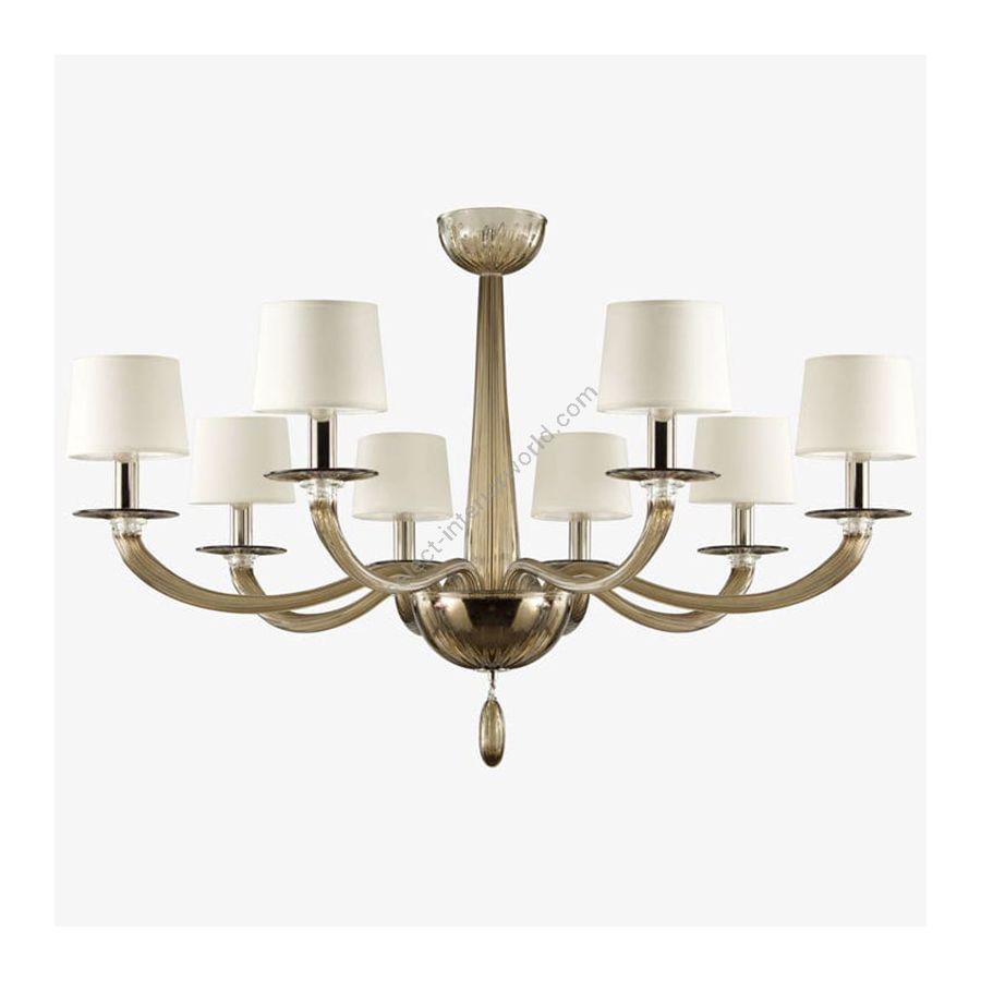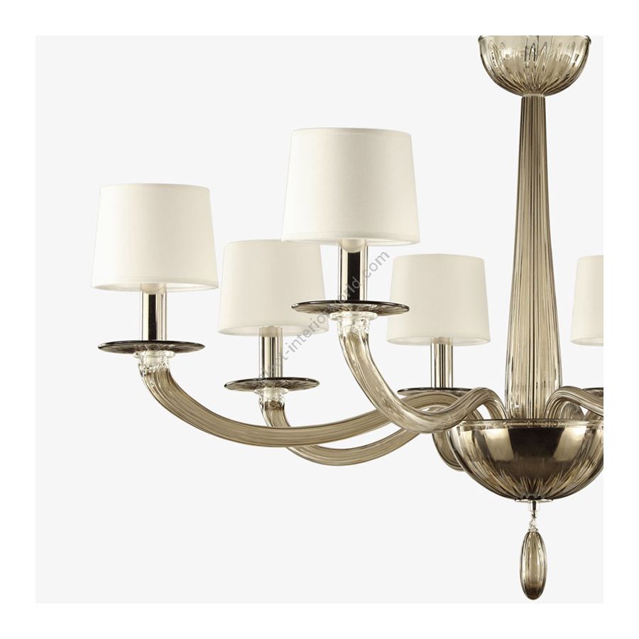 Die Kerzenbecher wurden durch einfache handgefertigte zweidimensionale Elemente ersetzt. Serenade wurde von jeglichem dekorativen Element befreit. Die einzige Ausnahme ist der elliptische, olivfarbene Anhänger, der an der Bodenschale aufgehängt ist. Die "Rigadin" -Technik, die auf feine Weise für alle Glasteile verwendet wird, verschönert diese Beleuchtungskreation. Raffinierte handwerkliche Lampenschirme aus Baumwolle vervollständigen die Komposition dieses Kronleuchters aus Muranoglas.