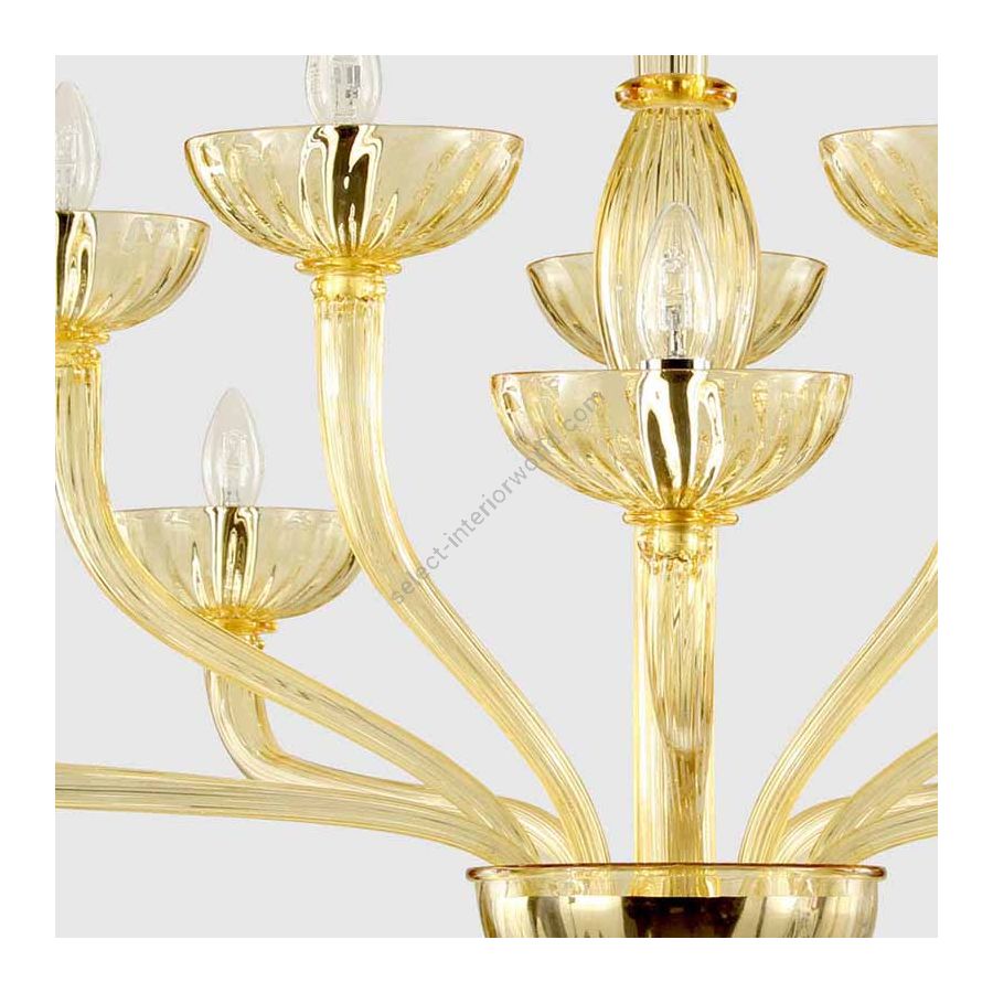 Dieser Kronleuchter geht auf die erste Hälfte des 20. Jahrhunderts zurück, als einige Neuerungen in der Glasbearbeitung eingeführt wurden: schlanke und leichte Elemente, winzige mundgeblasene Glaselemente, zügellose Arme und geripptes Glas. Dieser Kronleuchter ist insbesondere eine Hommage an einige berühmte Designer wie Carlo Scarpa, Napoleone Martinuzzi und Giò Ponti, die die Produktion der Murano-Öfen, die in dieser Zeit die Protagonisten einer echten Renaissance waren, innoviert haben.