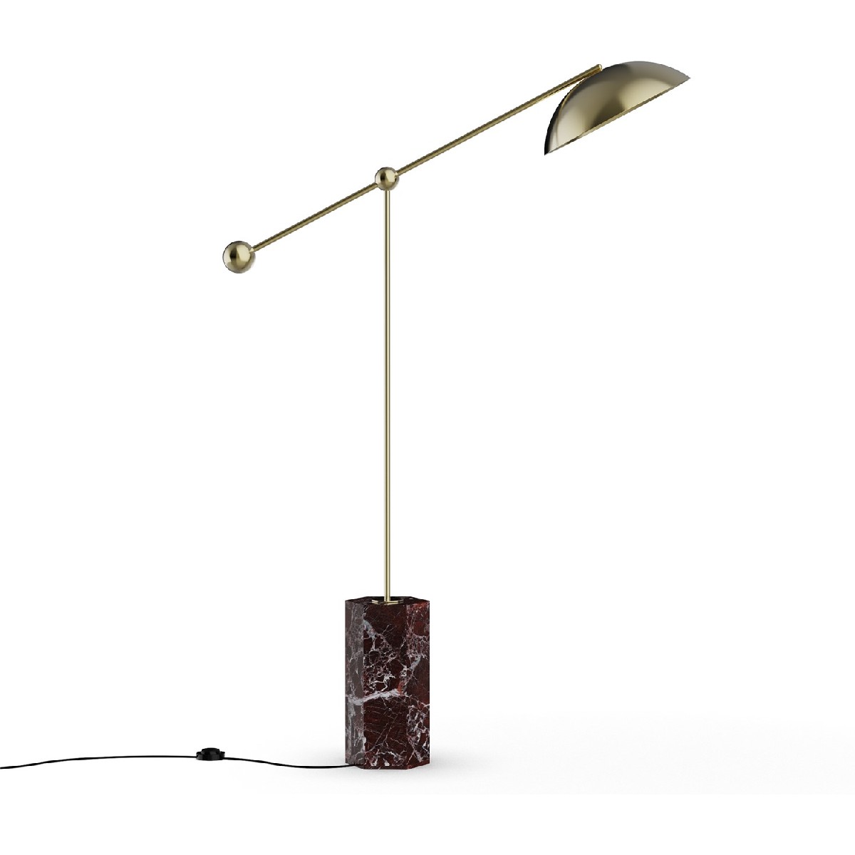 The Marc floor lamp is a striking combination of bold materials and refined engineering, making it a statement piece in any contemporary space. Its Porto Rosso marble base, with deep red hues and intricate veining, provides a grounding foundation that exudes natural elegance. Rising from the base, a polished metal structure extends into a sculptural, adjustable arm, offering both dynamic functionality and an architectural aesthetic. The sleek, reflective dome shade directs light precisely where needed, creating a warm yet focused ambiance. Designed for those who appreciate both form and function, the Marc floor lamp is an exquisite addition to modern interiors, from sophisticated lounges to stylish reading corners.