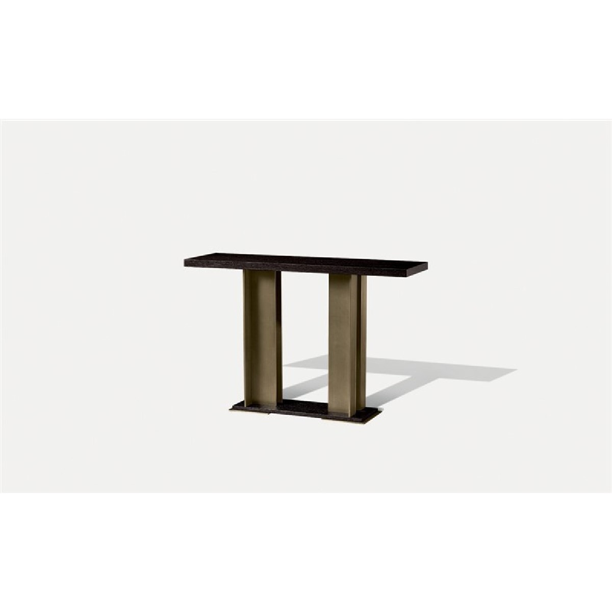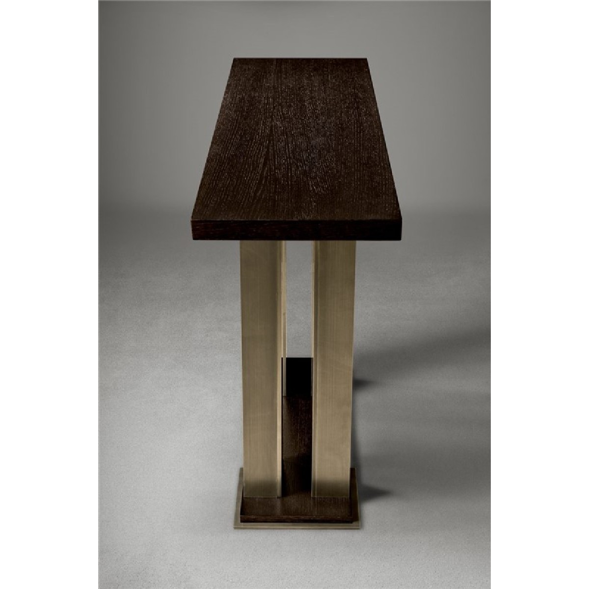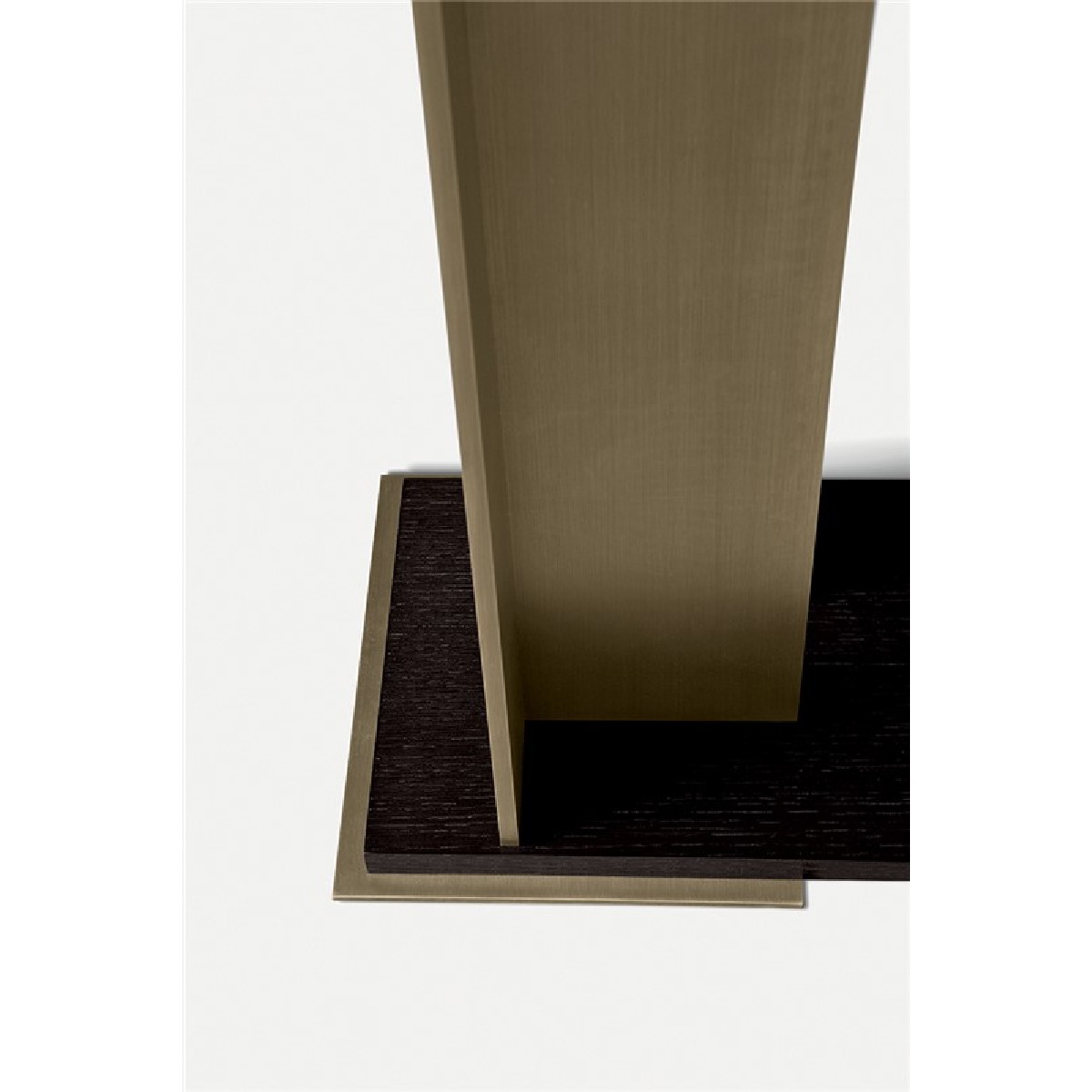 Console with top and base consist of veneered particleboard panels surfaced with oak sliced veneer, for wooden finish versions and of melamine paper to be lacquered, for lacquered versions. The metal base is made of four legs joined with slabs, available in bronze, gold and chrome finish.