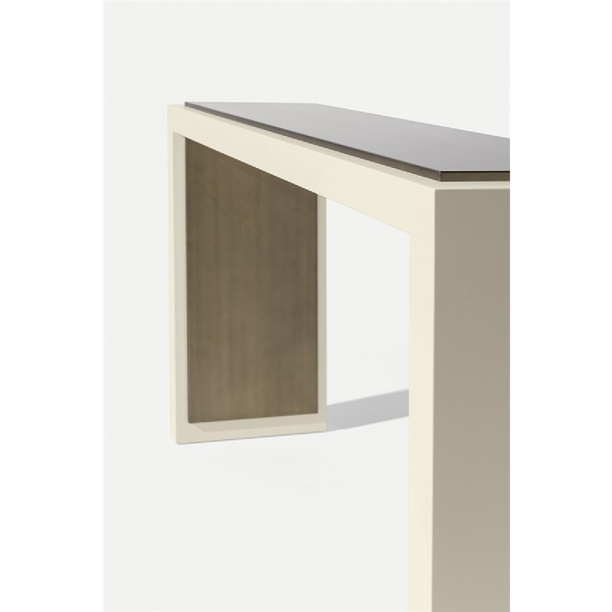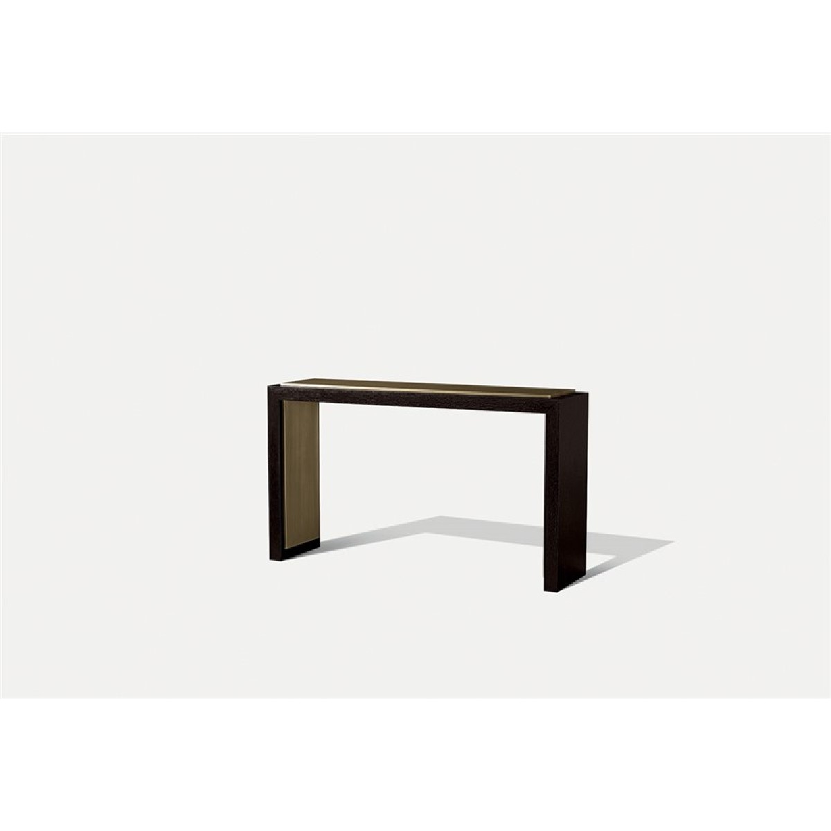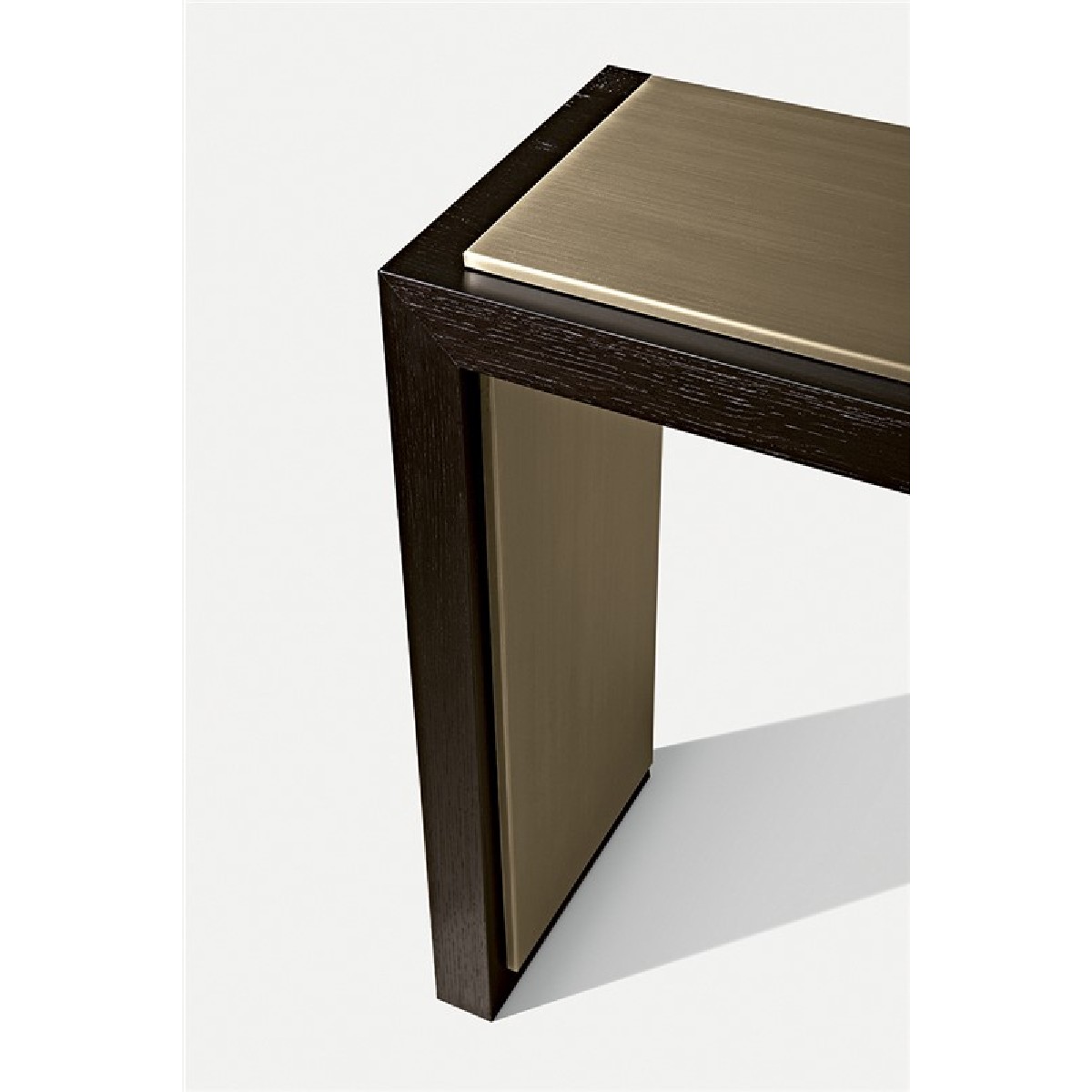 The console consists of top and legs joined at 45°, made of 6,0 cm thick veneered particleboard panels sur-faced with oak sliced veneer, for wooden finish versions and of melamine paper to be lacquered, for lacquered versions.