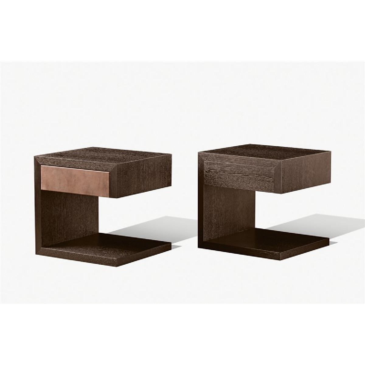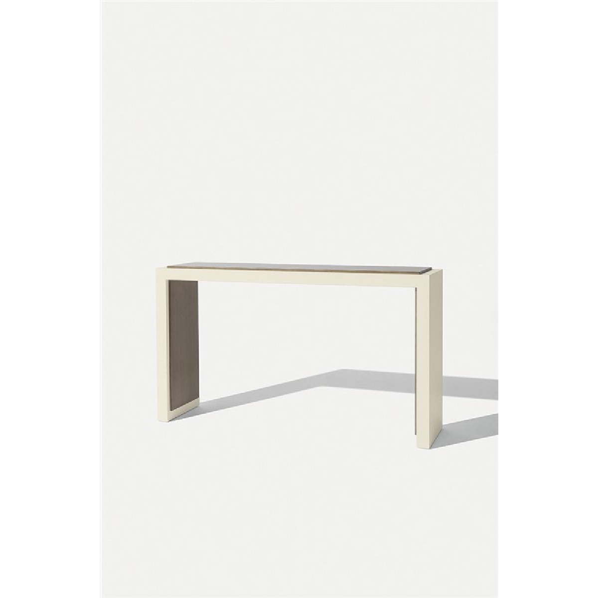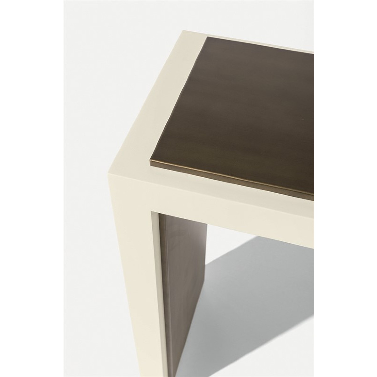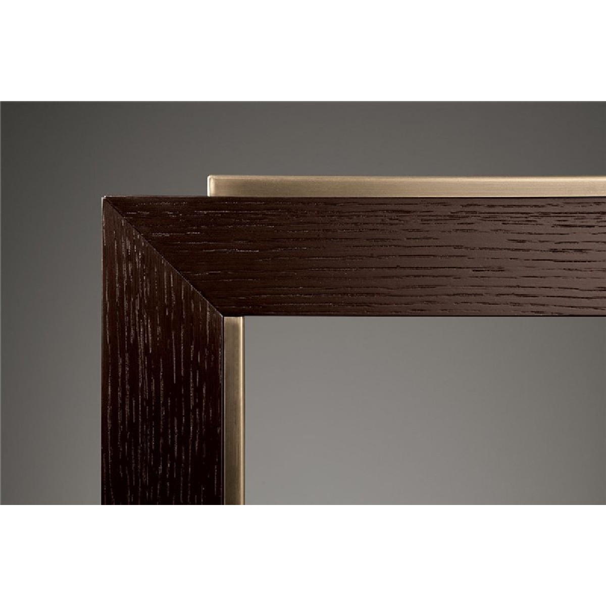 The console consists of top and legs joined at 45°, made of 6,0 cm thick veneered particleboard panels sur-faced with oak sliced veneer, for wooden finish versions and of melamine paper to be lacquered, for lacquered versions.