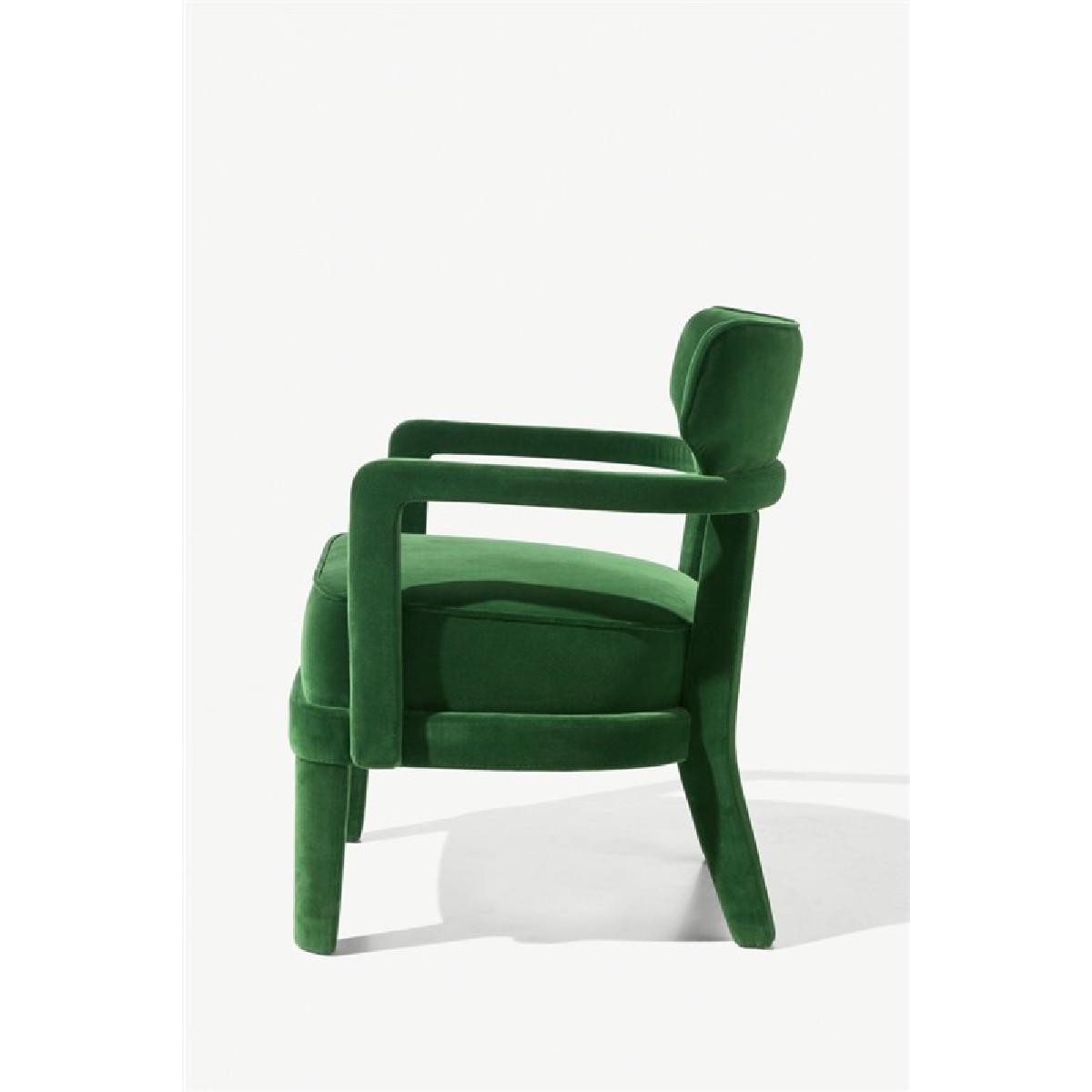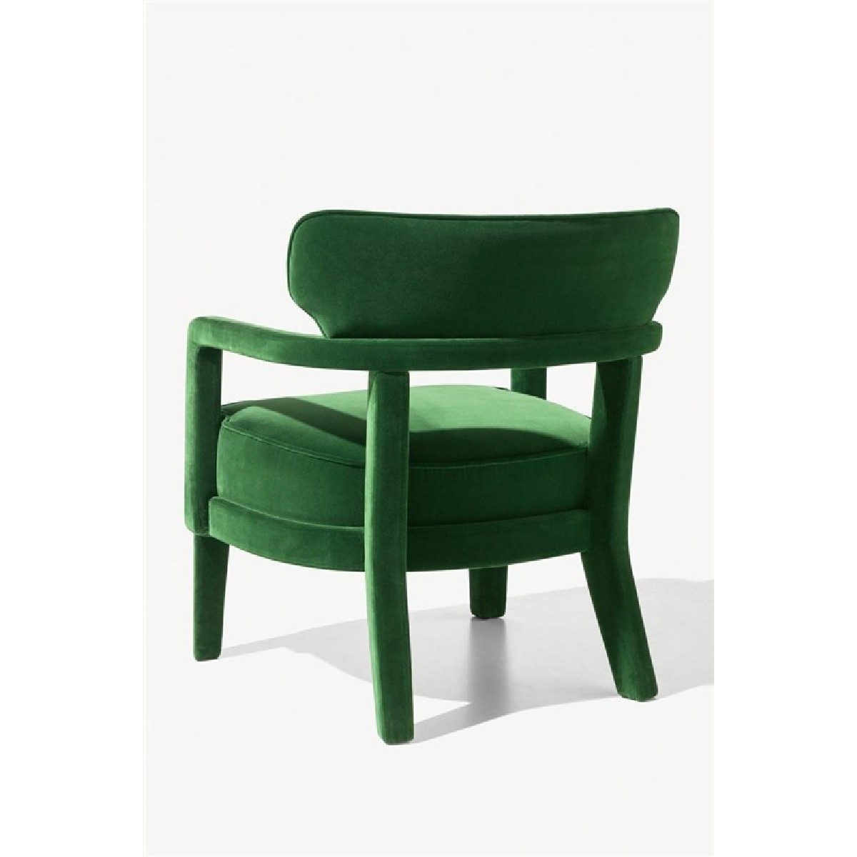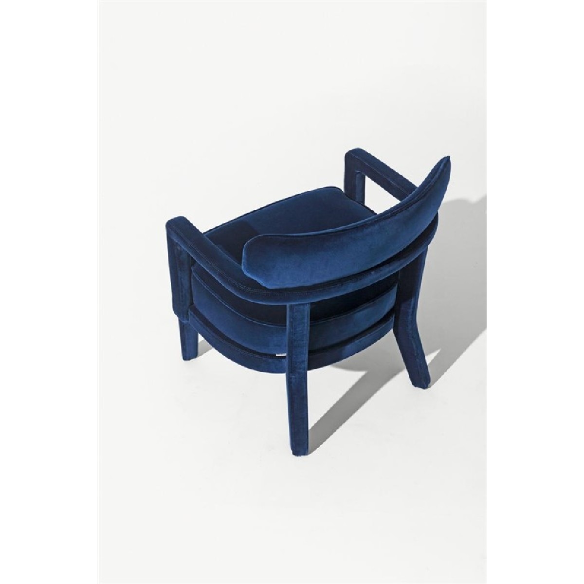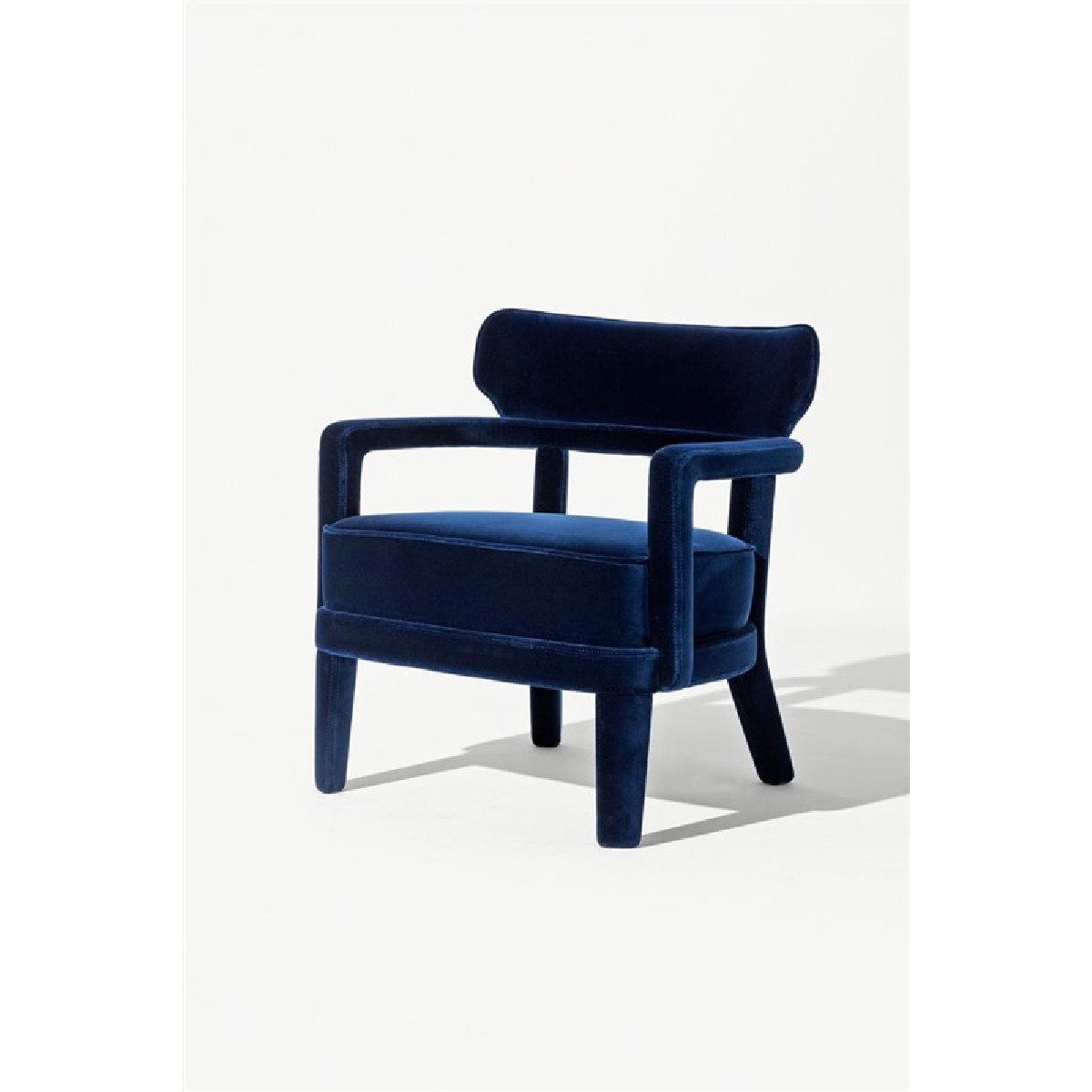 Small armchair with a curved plywood panels back, covering in fabric or leather.