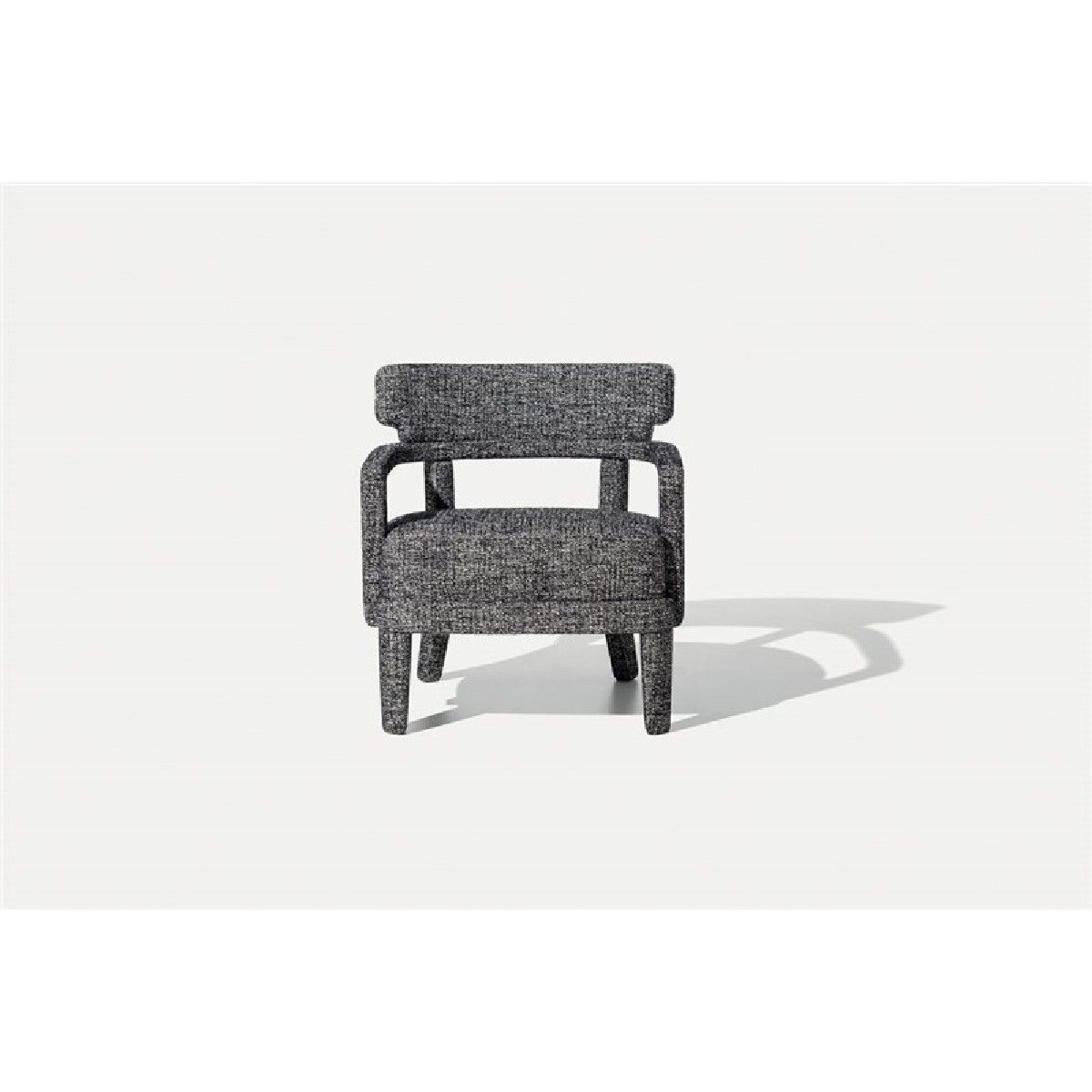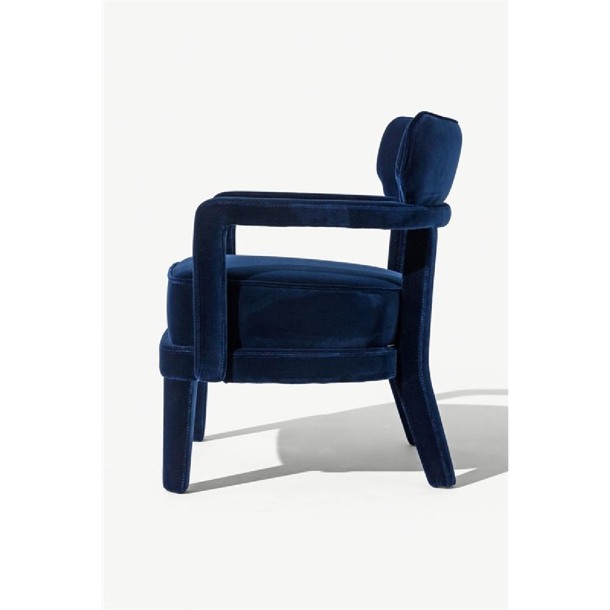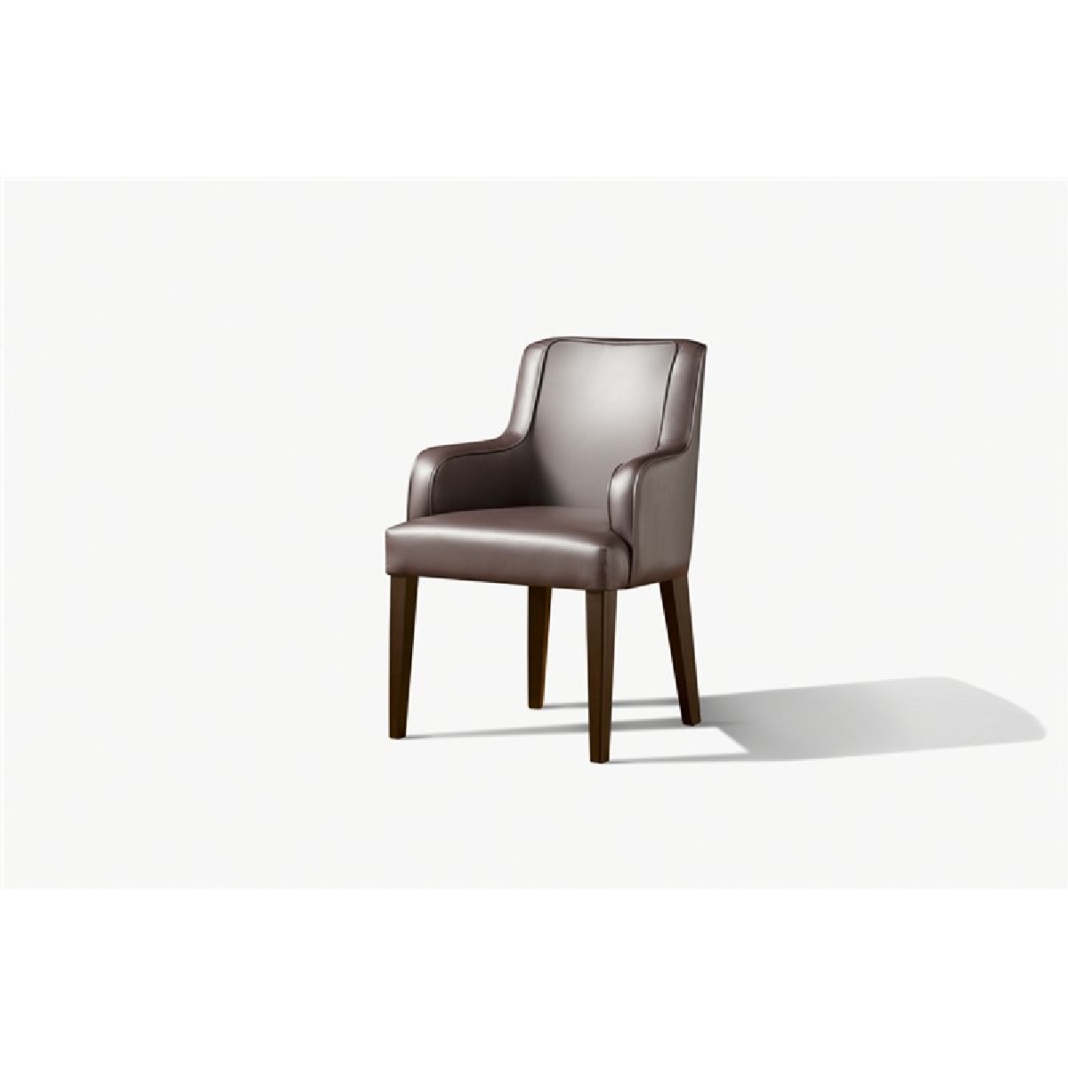 Small armchair with a curved plywood panels back, covering in fabric or leather.