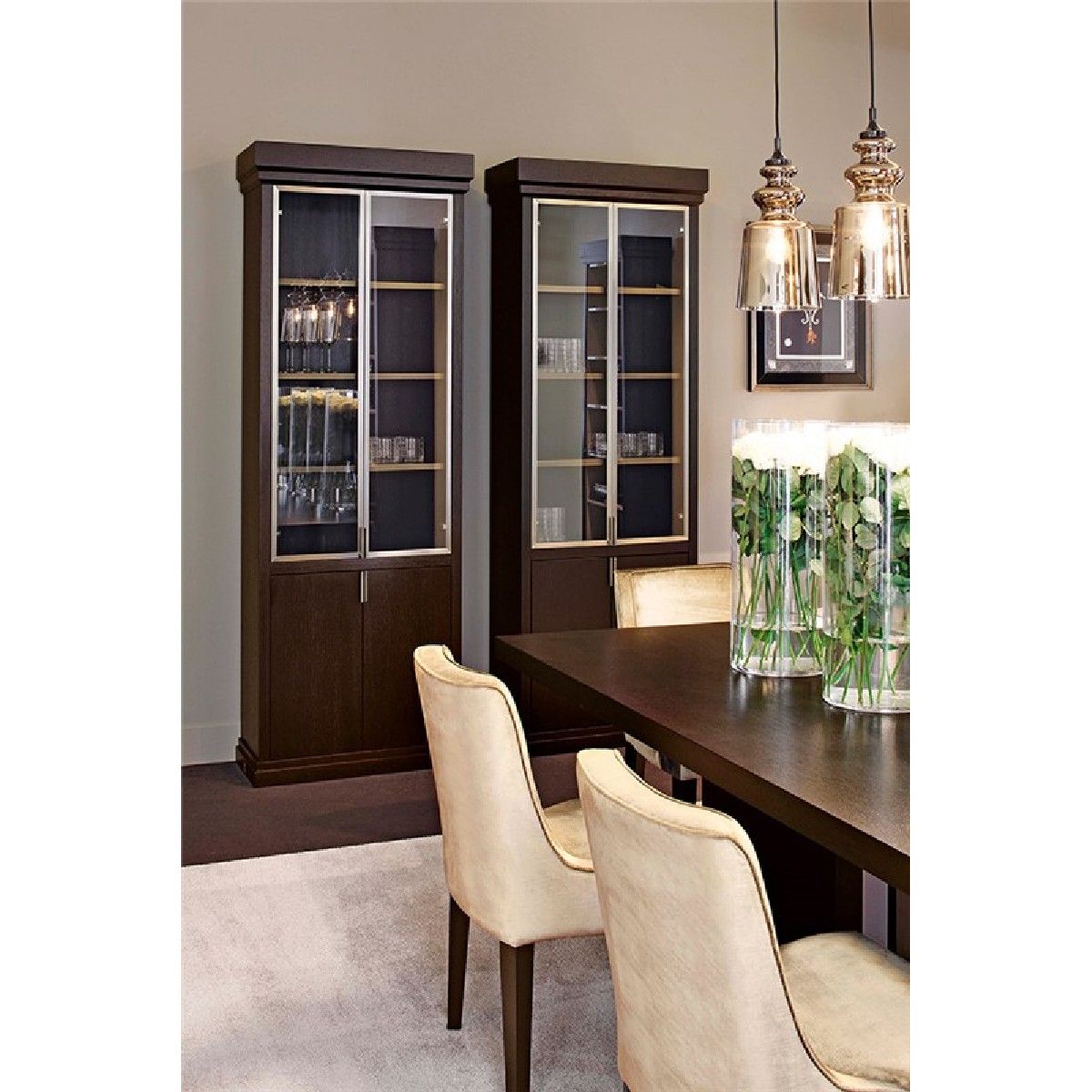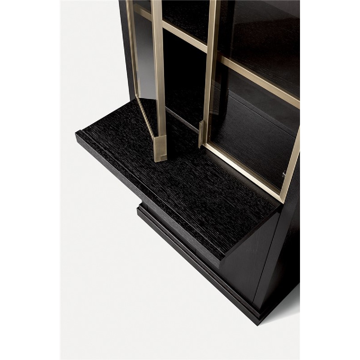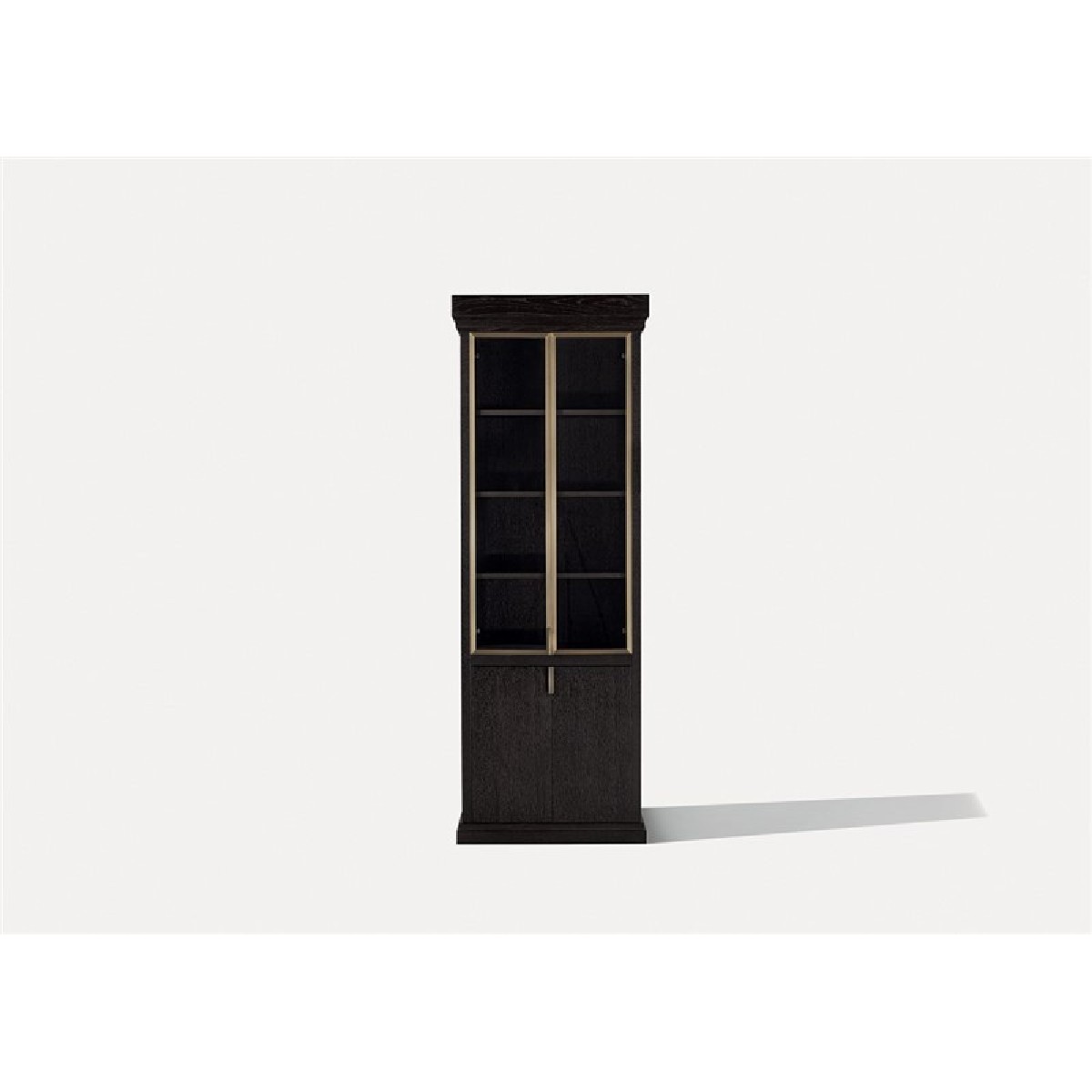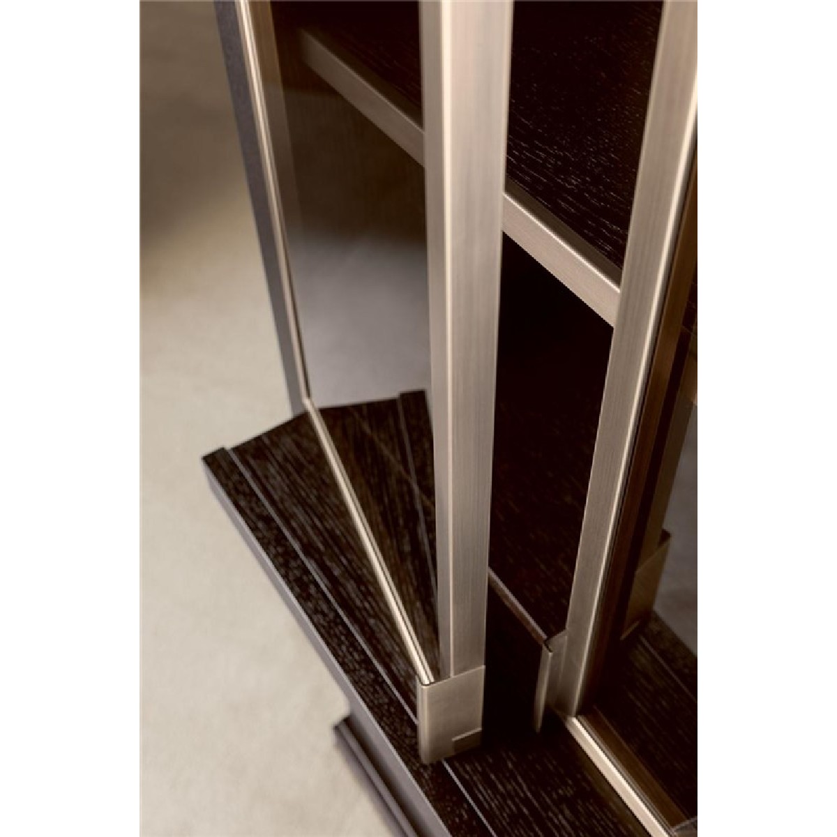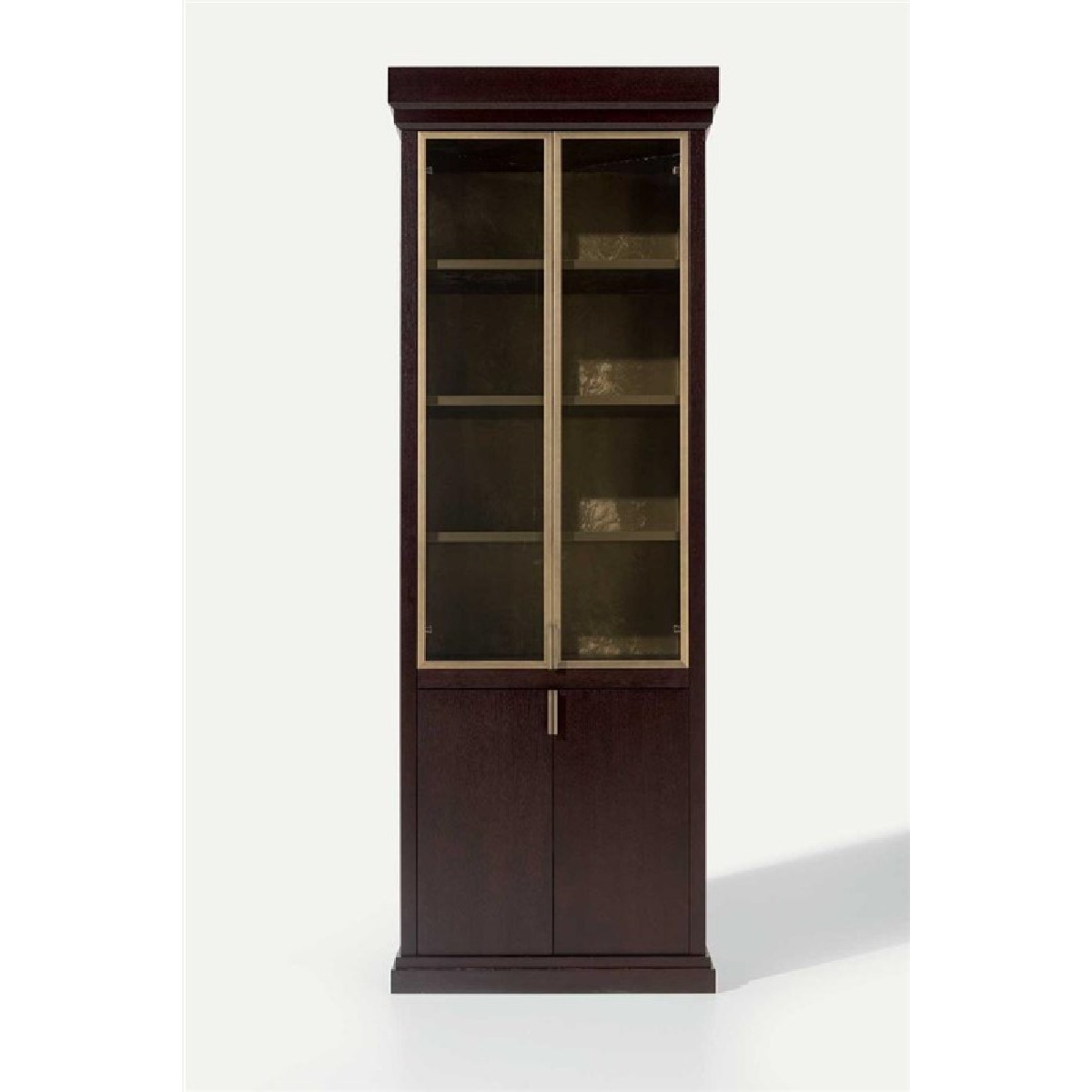 Glass cabinet, with a top and base frame of the unit entirely made of solid wood coated – for wooden versions – of the finest oak-wood sliced veneer, without any knots, and joined at 45° to one another.