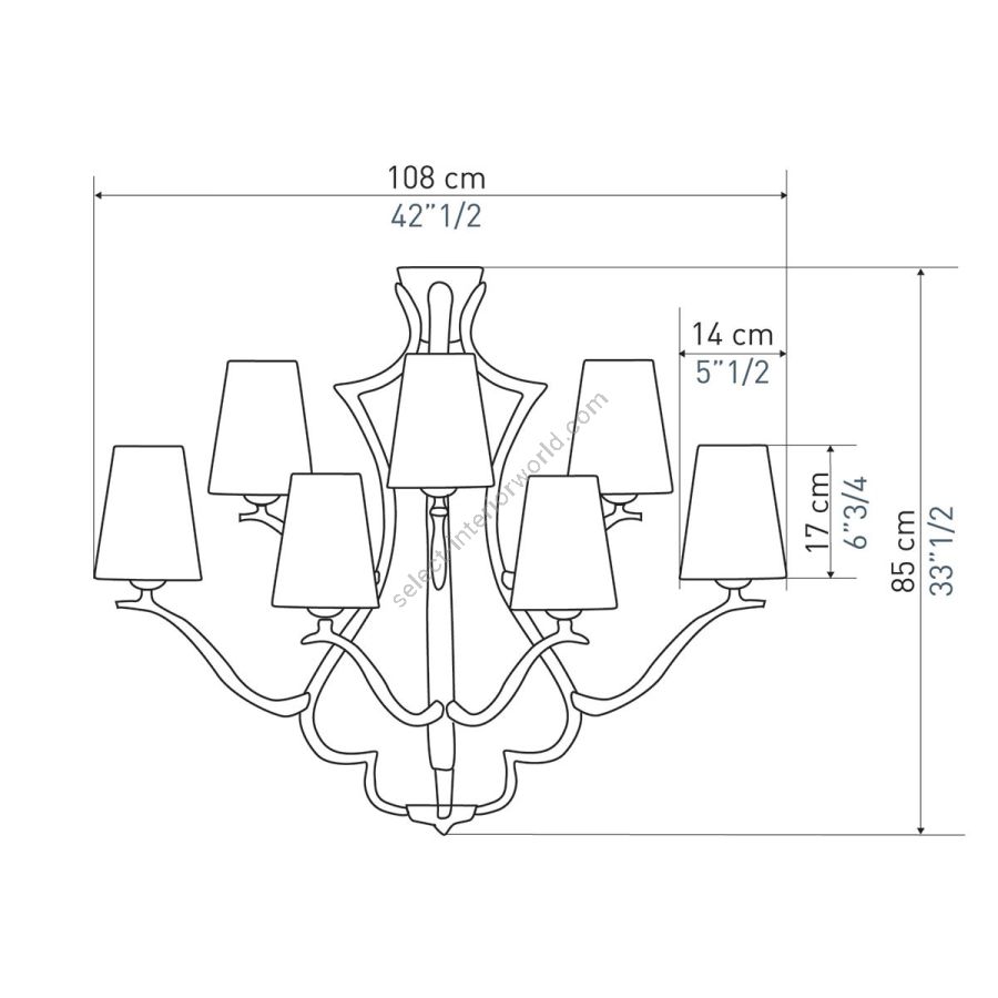 Width: 108 cm, Maximum: 15 x 40 w, Les Abat-jours peuvent être fabriqués dans 18 coloris au choix, The colour for the shades can be chosen out to 18 different hues