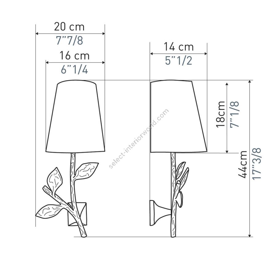 Width: 20 cm, Projection: 14 cm, Maximum: 40 w, Les Abat-jours peuvent être fabriqués dans 18 coloris au choix, The colour for the shades can be chosen out to 18 different hues