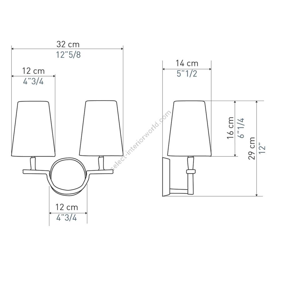 Width: 32 cm, Projection: 14 cm, Maximum: 2 x 40 w, Les Abat-jours peuvent être fabriqués dans 18 coloris au choix, The colour for the shades can be chosen out to 18 different hues