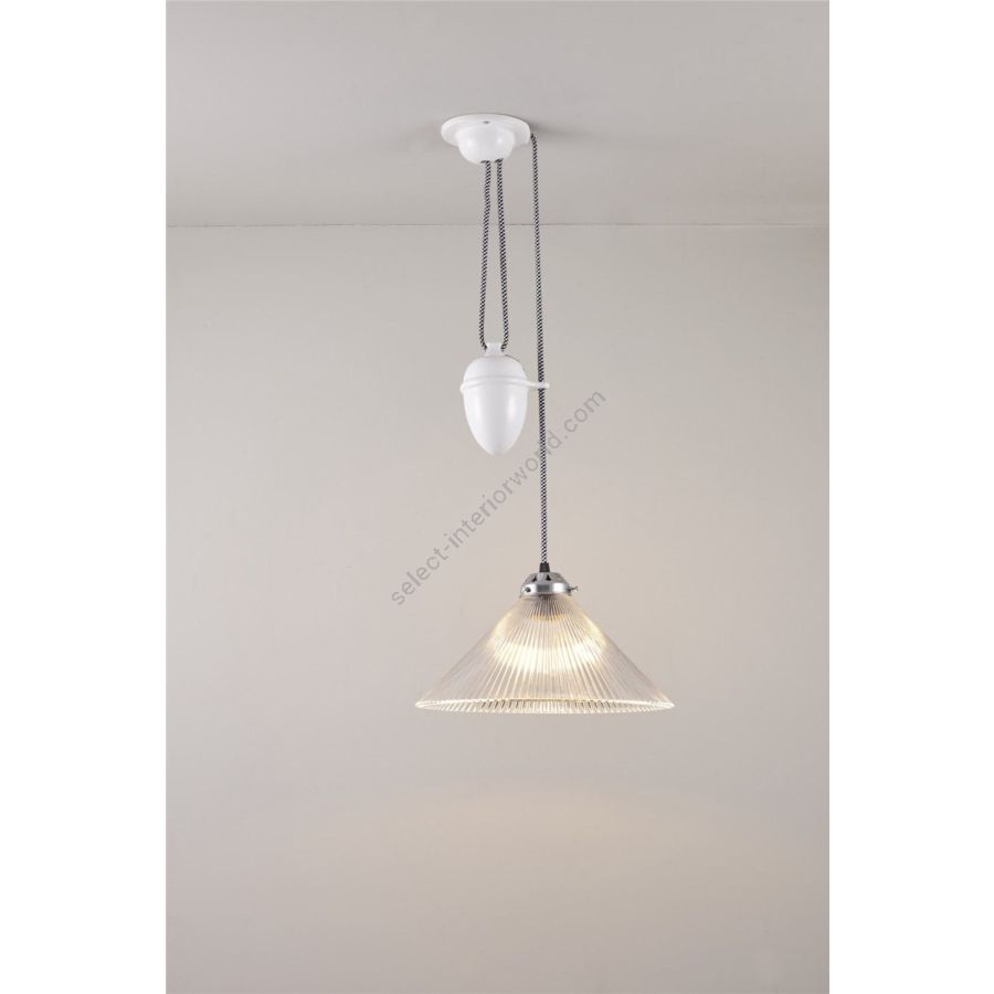 Traditionally inspired with a modern twist, the Conical Prismatic Rise and Fall Pendant allows you to adjust the height and vary lighting effects, making it the perfect choice for dining tables and kitchens; simply lower the light for intimate dinners or raise for a broader pool of general light. The prismatic glass shade allows for an even dispersion of light, and is finished with our signature cotton braided cable.