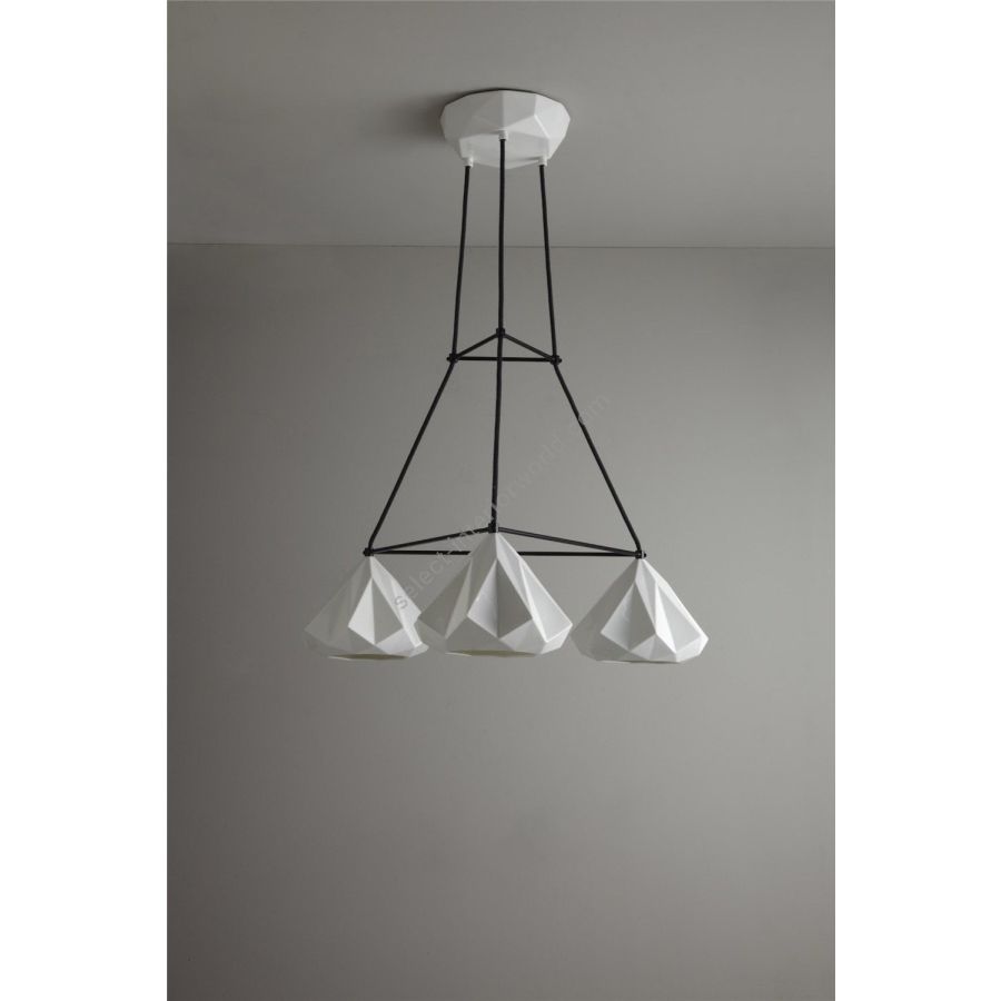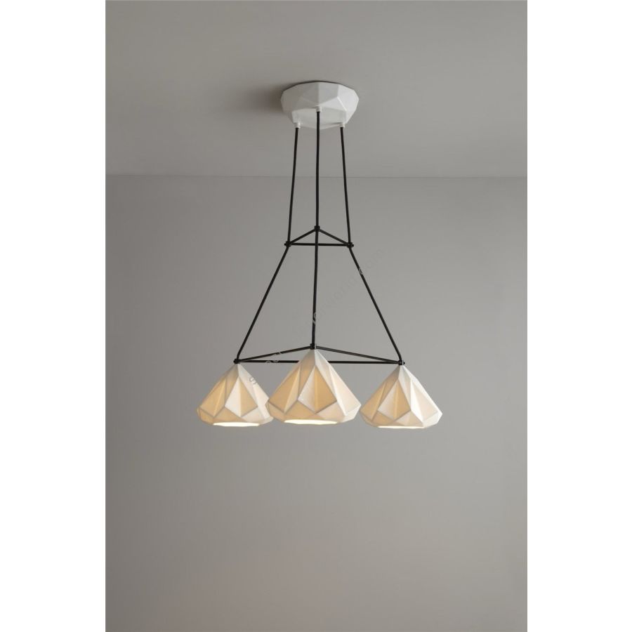 The Hatton 1 Triangular Grouping Pendant is a truly iconic statement piece. Using a highly skilled process, we have been able to transform the bone china shade into an intricate, multi-faceted, gem-like form. When switched 'off' the pendant has an angular sculptural beauty, and when 'on' it provides warm illumination with dramatic lines and shadows.