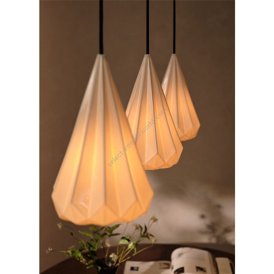 The Hatton 3 Pendant has a beautifully intricate bone china shade. Using a highly skilled process, we have been able to transform bone china into a multi-faceted, symmetrical, gem-like form. When switched 'off' the pendant has an angular sculptural beauty, and when 'on' it provides warm illumination with dramatic lines and shadows.