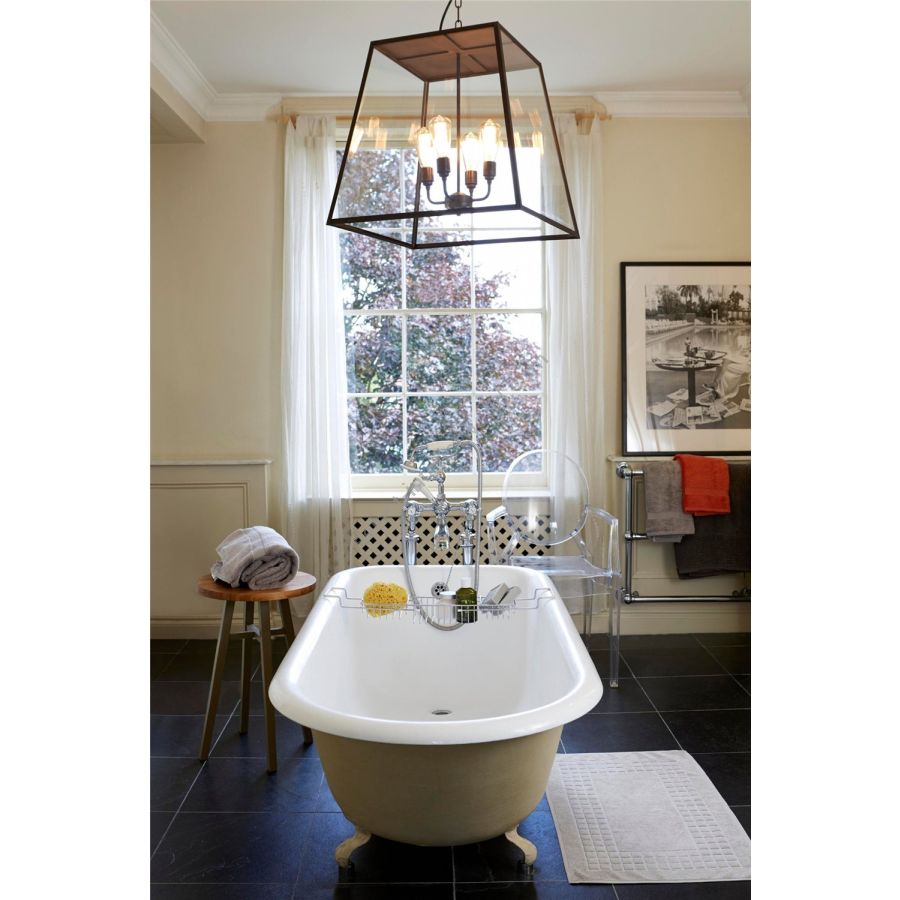 Our Extra Large Quad Pendant offers a sophisticated industrial lighting solution. Available in weathered brass and suspended on a complementary weathered brass hook and 1.5 meters of chain (more on request). IP43 rated and complete with a closed top, this pendant is suitable for exterior use.