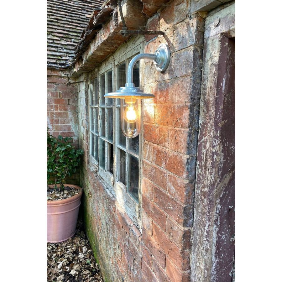 An Exterior Bracket Light (with reflector) with right angle arm and round base is a traditional marine inspired fixture. Skillfully cast at our Birmingham metalworks and rated IP54, this is the perfect outdoor wall light. Available in galvanised or black. Galvanised guard sold separately. N.B. This product is galvanised underneath so the paint finish will not be completely smooth.