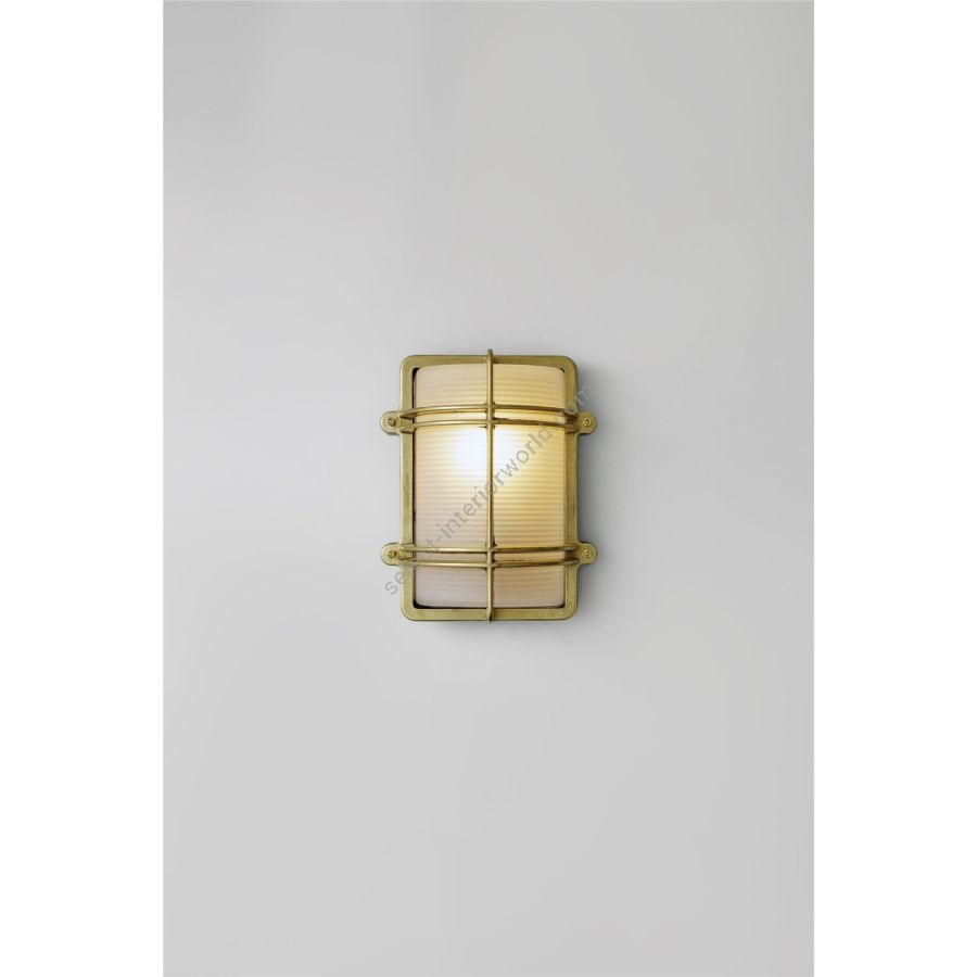 Die-cast rectangular bulkhead light with a curved frosted glass diffuser. Available in natural brass (unlacquered), weathered brass and chrome plated finishes. Front guard secured with socket head screws.