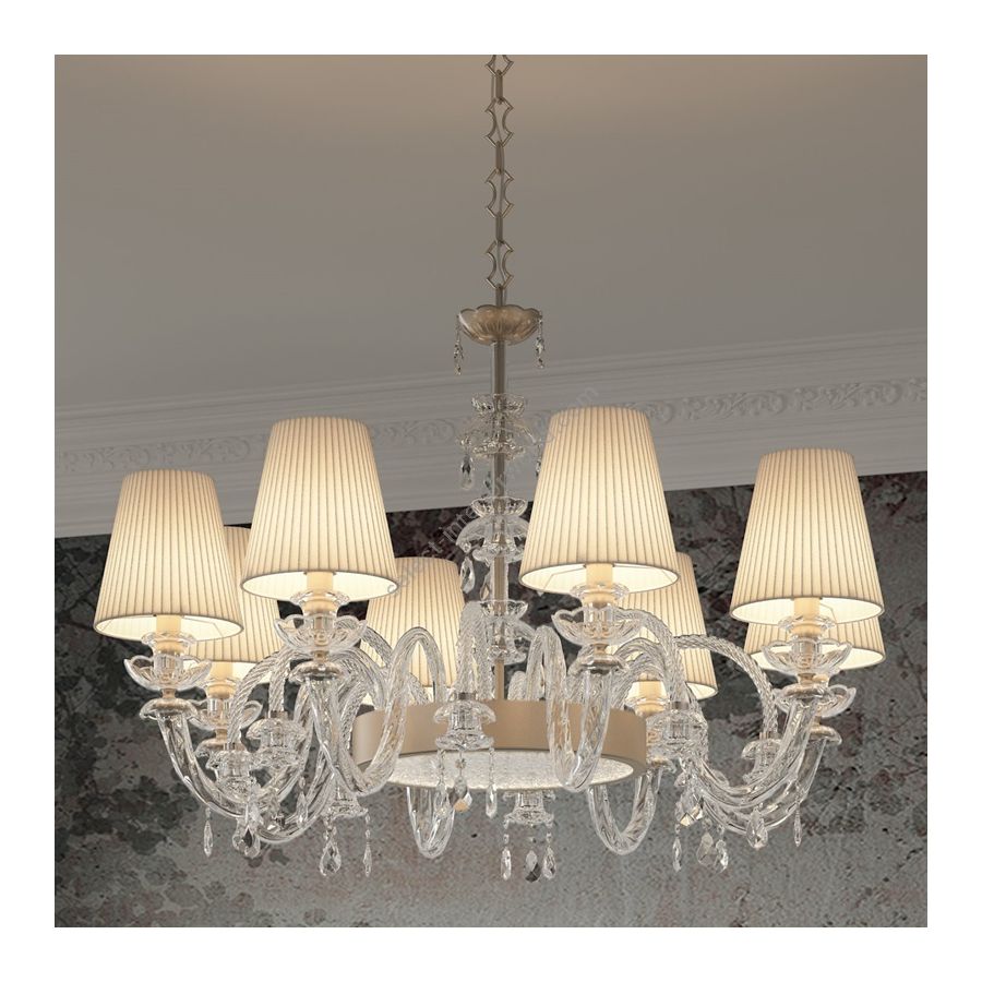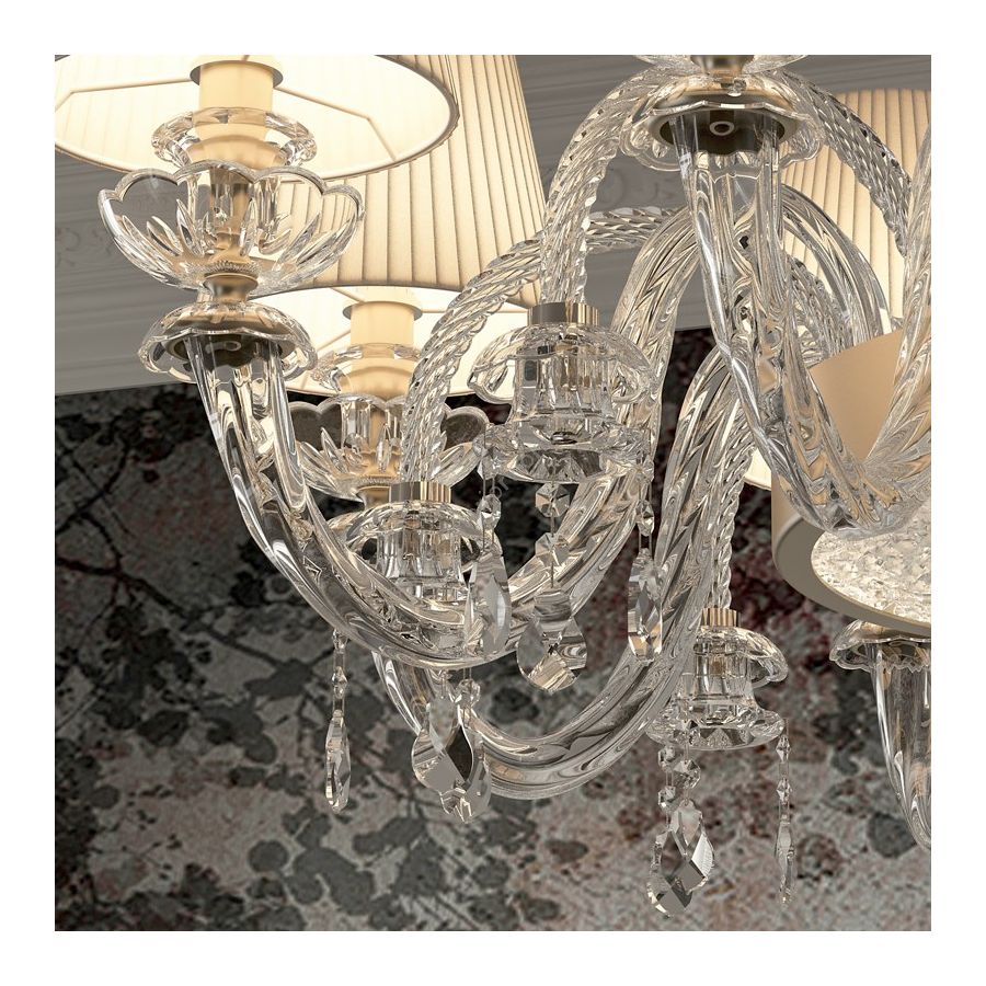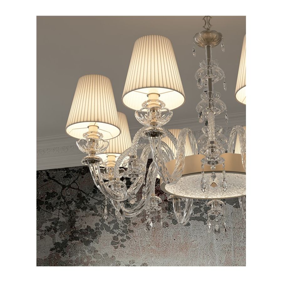 Handgefertigter Kronleuchter aus Muranoglas mit breiten Armen, Stofflampenschirmen und LED-Licht.