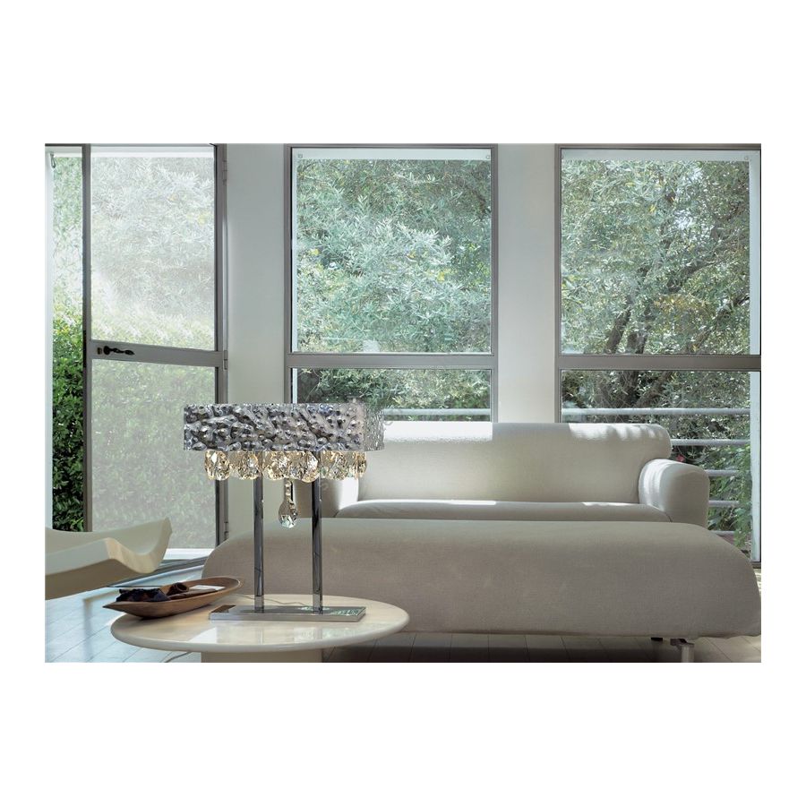 Tischlampe mit Struktur aus gehämmertem Metall und farbigen Kristalltropfen.