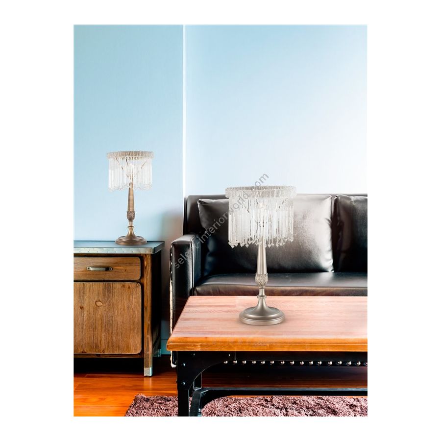 Tischlampe mit handgefertigtem Rand aus klaren oder bernsteinfarbenen Muranoglasperlen und einem Rahmen in Bronze, Taubengrau oder Grau.