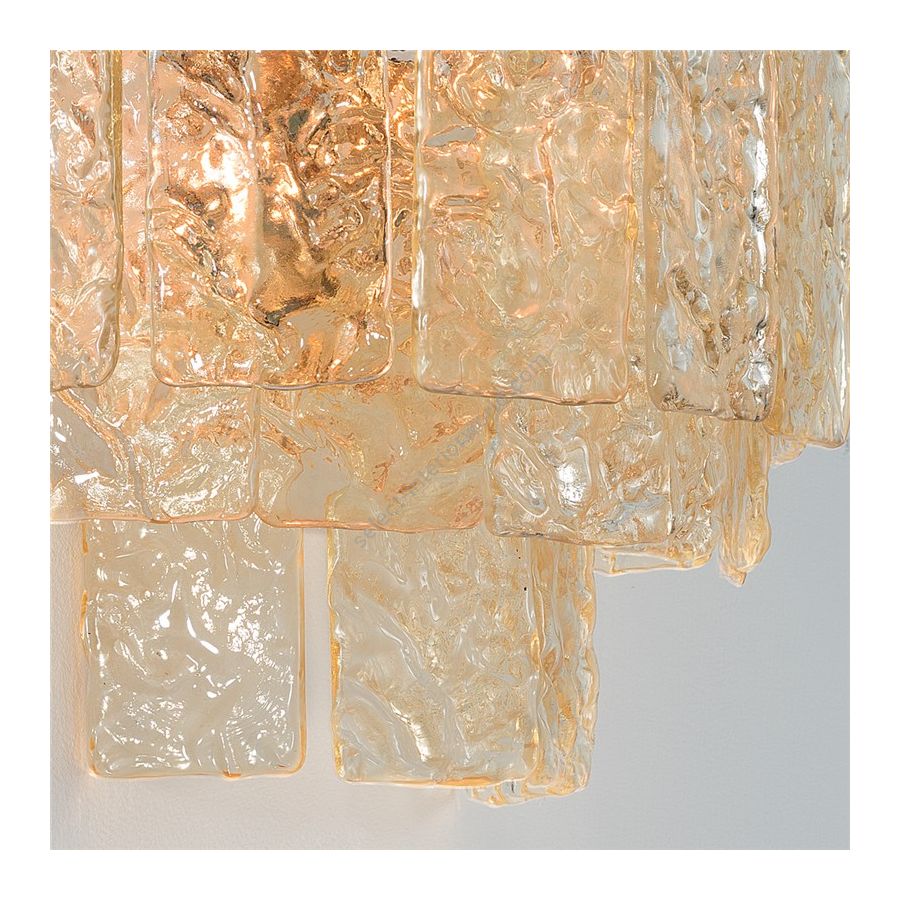 The decorative elements are plates in murano glass shaped through specific moulds and hammered by hand, avaialble in the following finishes: clear, amber, smoked..