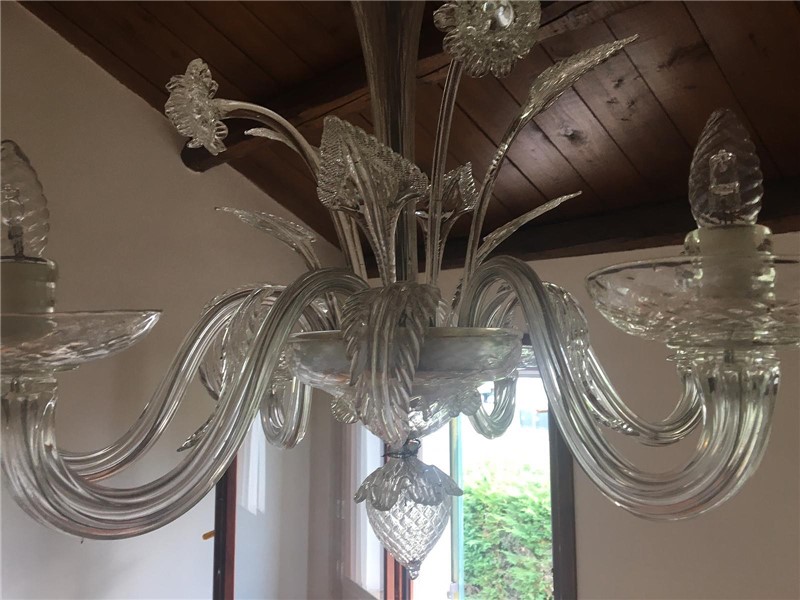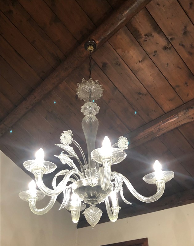 Chandelier with a vintage style, with wide arms, cups and pendants in hand-blown murano glass.