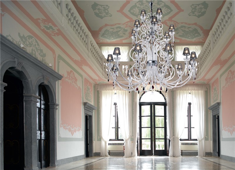 A venetian chandelier with wide arms, fabric shades and multifaceted crystal or swarovski pendants. Available as clear or colored. Find out more