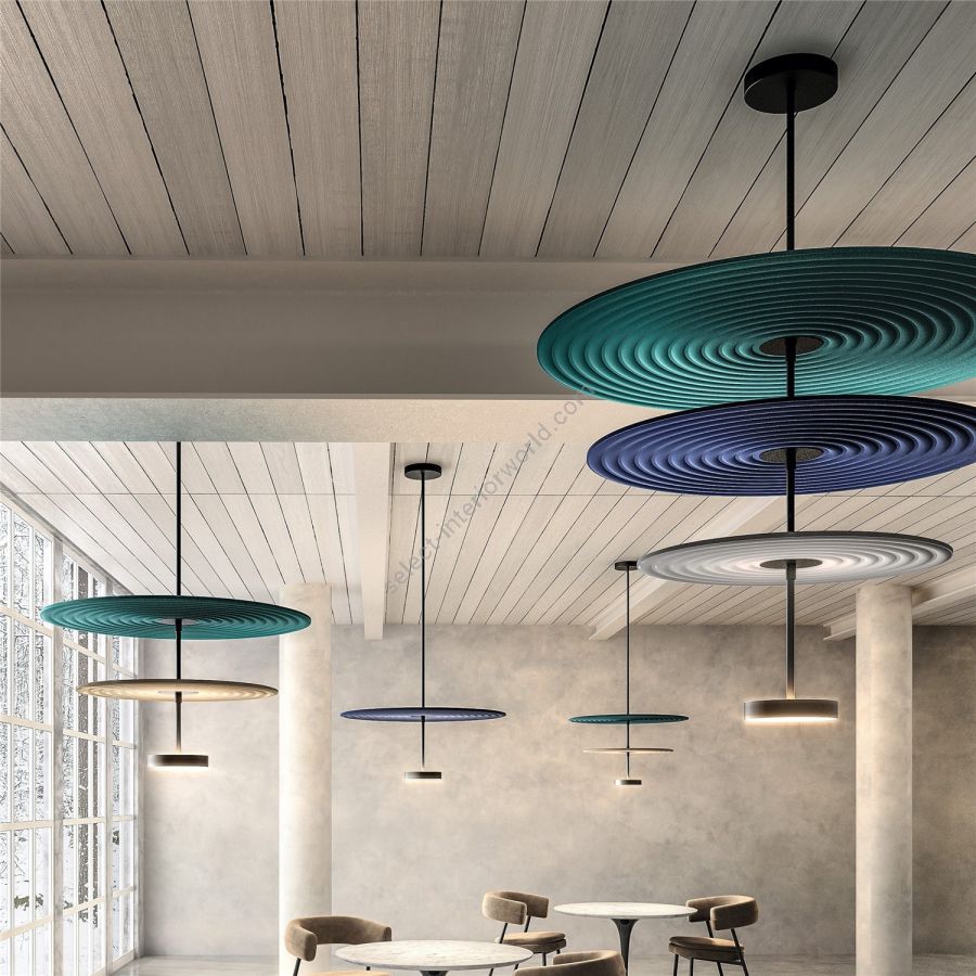 Feel comes from the combination of sound absorbing textile discs and luminous stems. The coloured discs, in matching or contrasting colours, give life to ever-changing configurations, to be suspended from the ceiling in order to absorb noise and improve acoustic comfort.