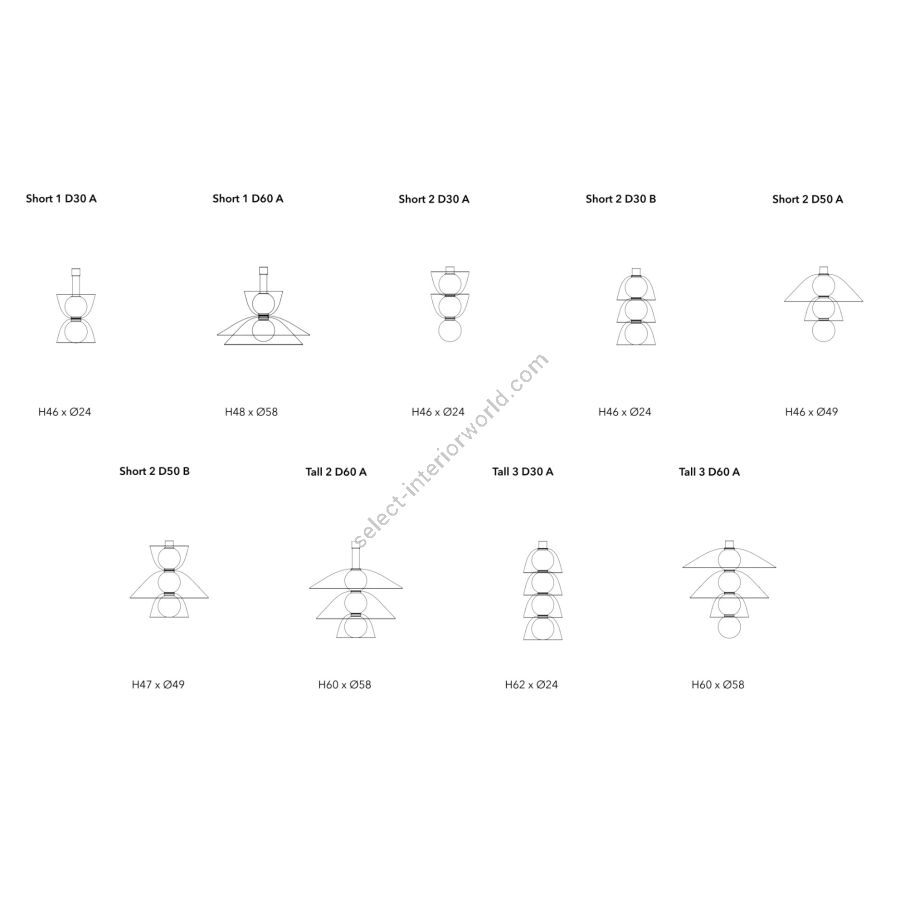A lighting system composed by six combinable elements: three shades in growing diameters fit onto a light source provided with a sphere and a tube. The various combinations, which are potentially infinite, are spread through a kaleidoscope of soft and gradient colours immersing the environment in a suggestive atmosphere. An intricate dovetailing game that is solved technically in an at once articulated and simple manner, like precious pearls delicately strung on a necklace of light with subdued transparencies that shape a marvellous prism of visual effects as they enter into play with the diverse textures of the finishes.