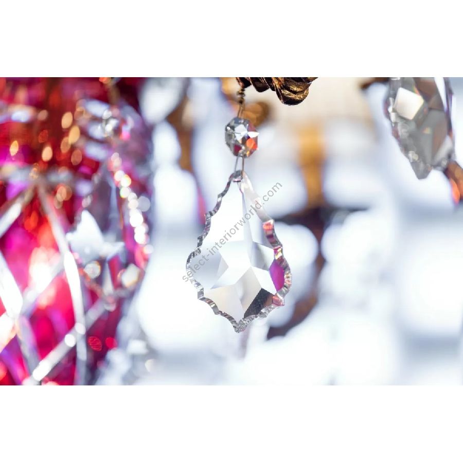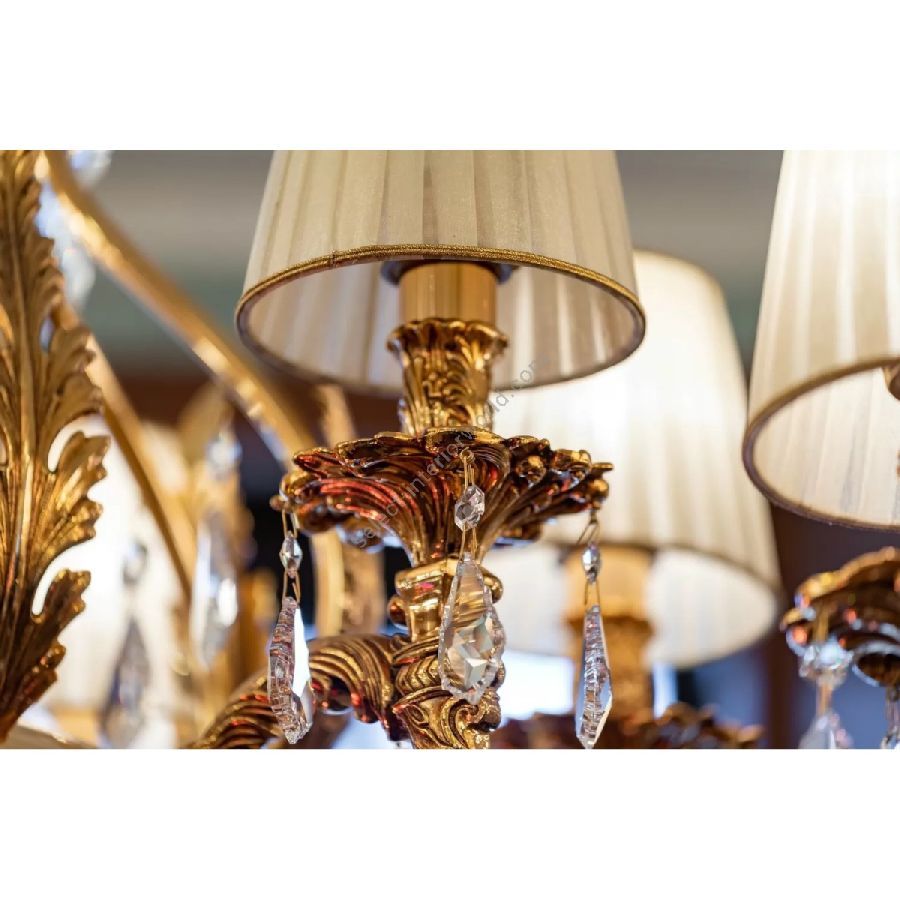The Lara collection consists of luxurious and important chandeliers in shaded pure gold finish, with crystal cup available in amber and red colors, enriched with pleated organza lampshades and precious Schoeler crystals. Available in two different sizes. Applique in worked brass with lampshades and Schoeler crystals in combination.