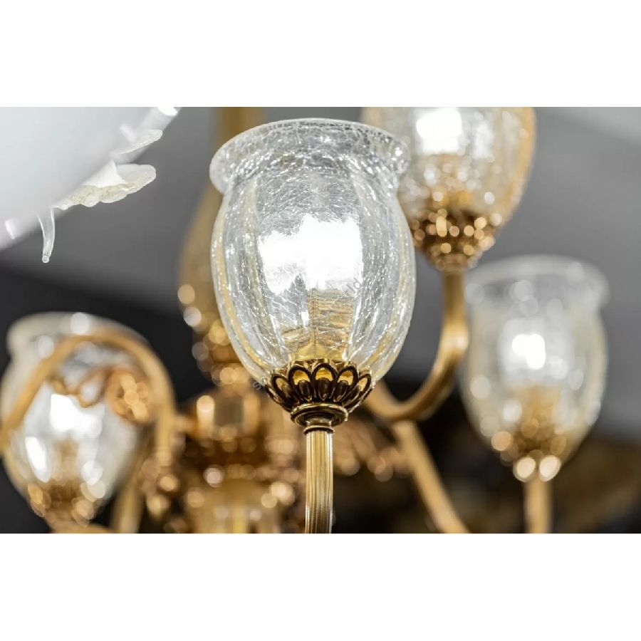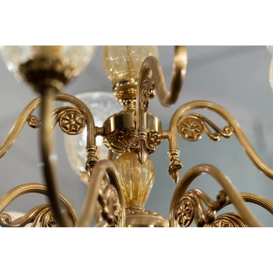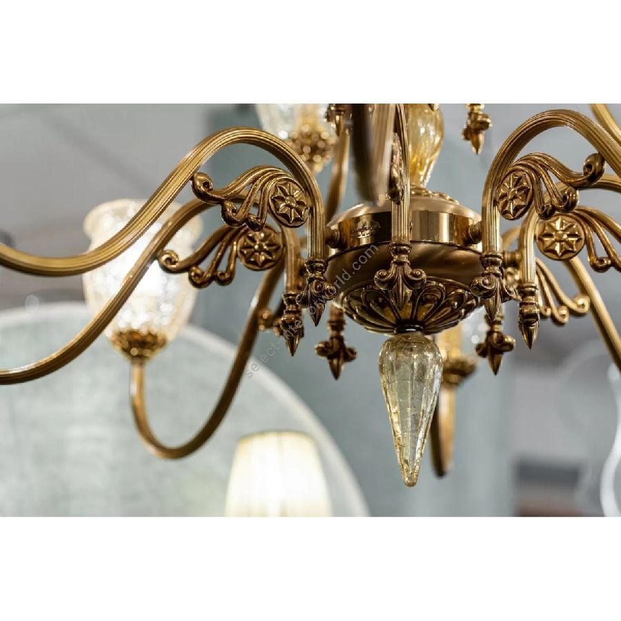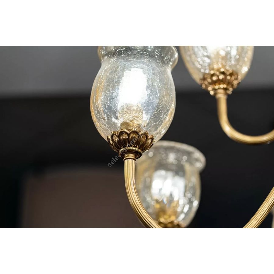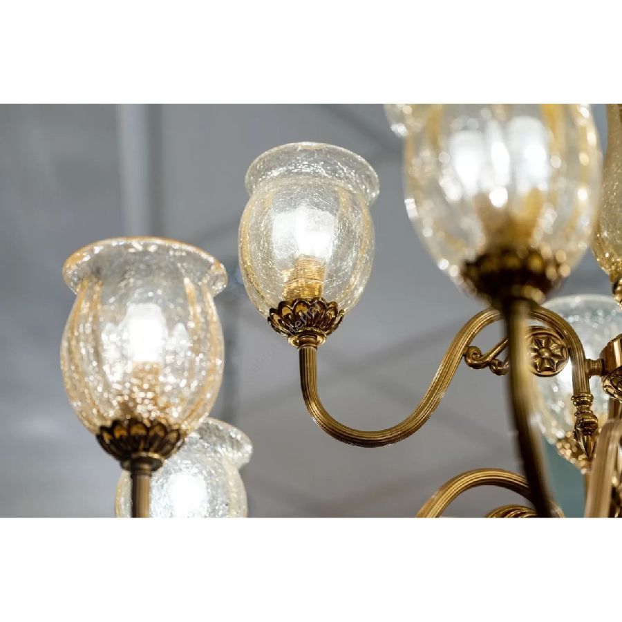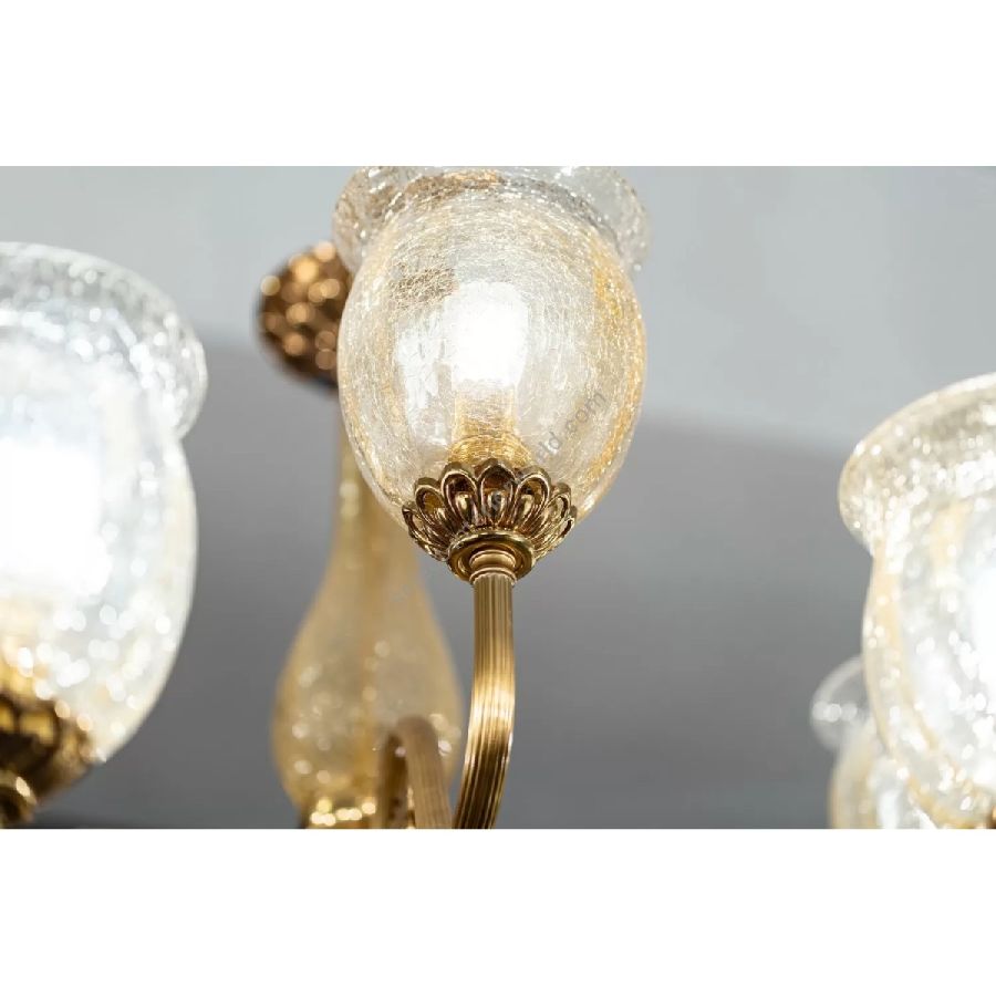 Complete collection made of brass with French gold or satin finish with amber 'Craqué' glasses. Chandeliers in various sizes, wall lamps, table and floor lamps with ivory pleated organza lampshade are available. Customizable in finishes and sizes.