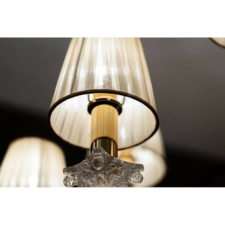 This refined and elegant collection of chandeliers, applique table and floor lamps is the perfect combination of subtle and elegant brass and crystal with slender shapes. The lampshades that complete it can be in cream organza or in shantung. Customizable in finishes and sizes.